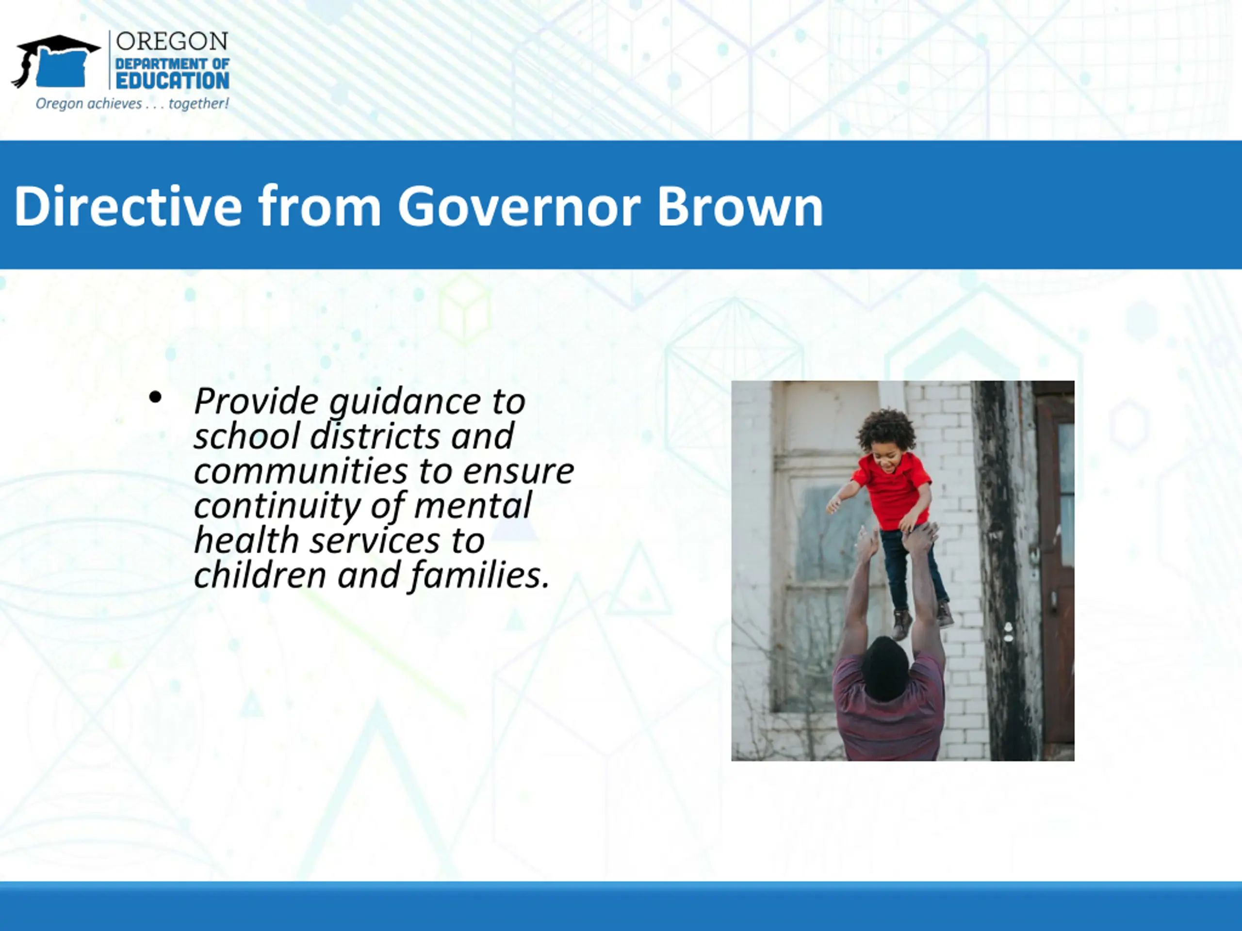 Directive from Governor Brown Provide guidance to school districts and communities to ensure continuity of mental health services to children and families.