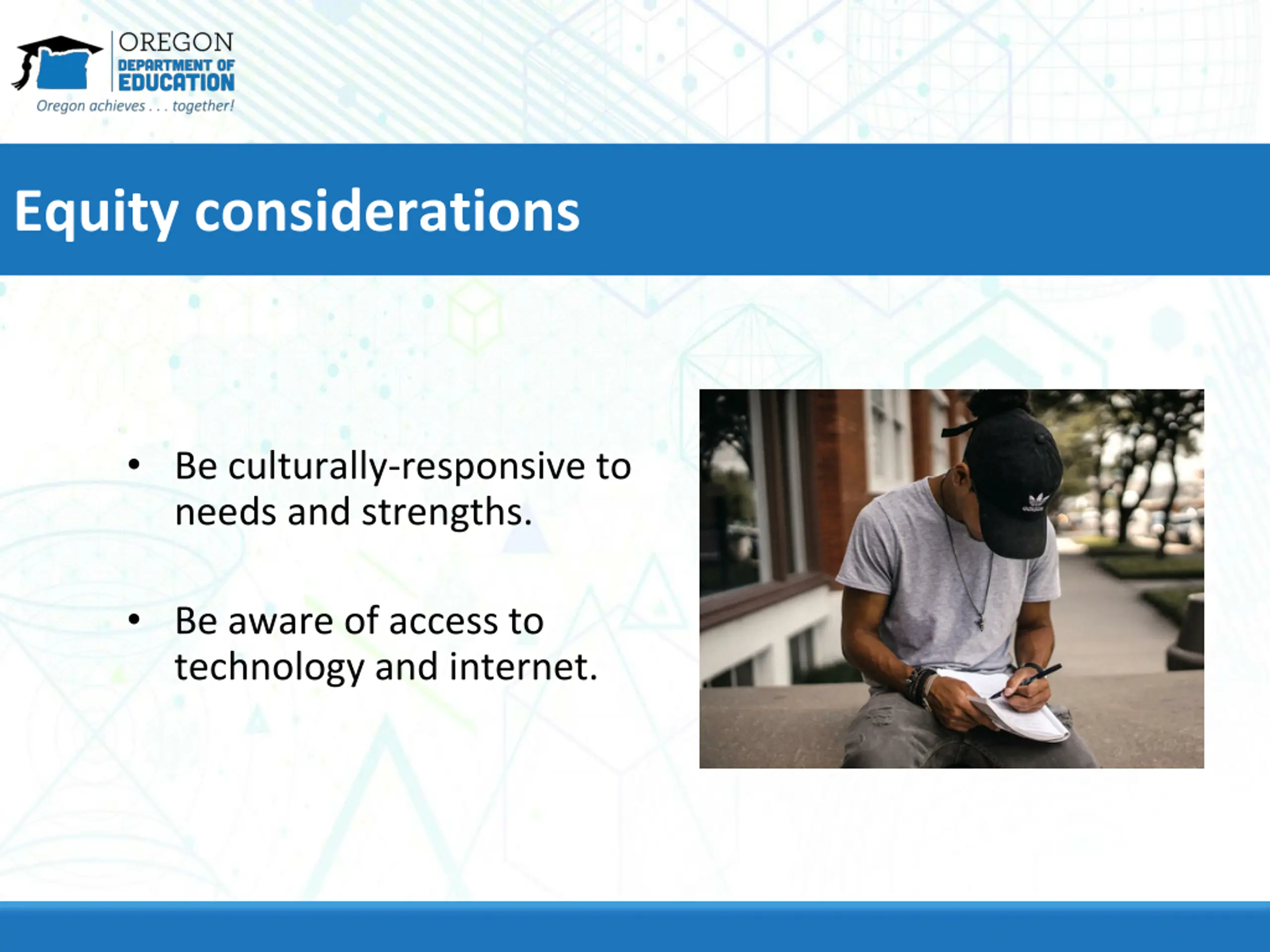 Equity considerations Be culturally-responsive to needs and strengths. Be aware of access to technology and internet.