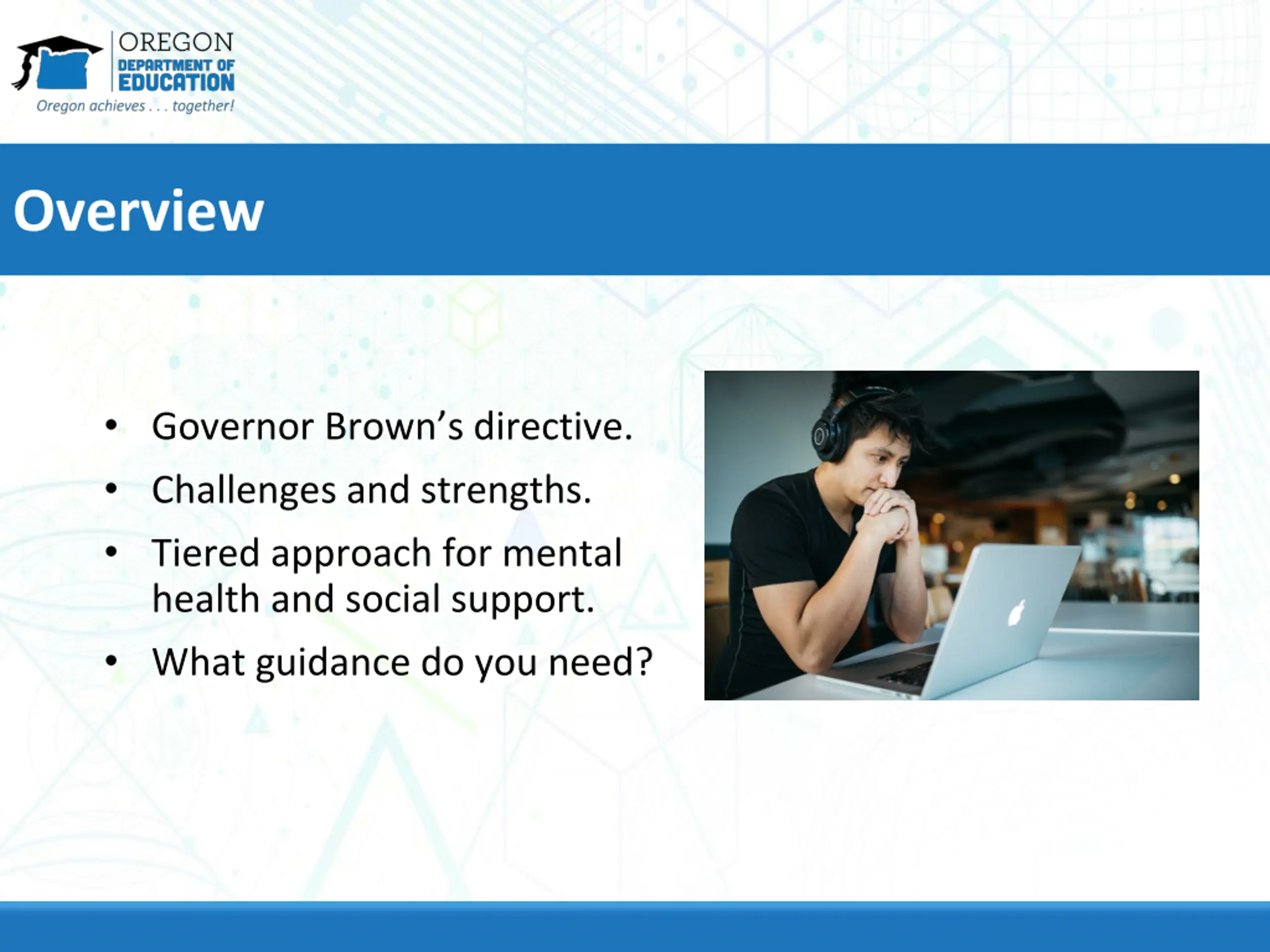 Overview Governor Brown s directive. Challenges and strengths. Tiered approach for mental health and social support. What guidance do you need?