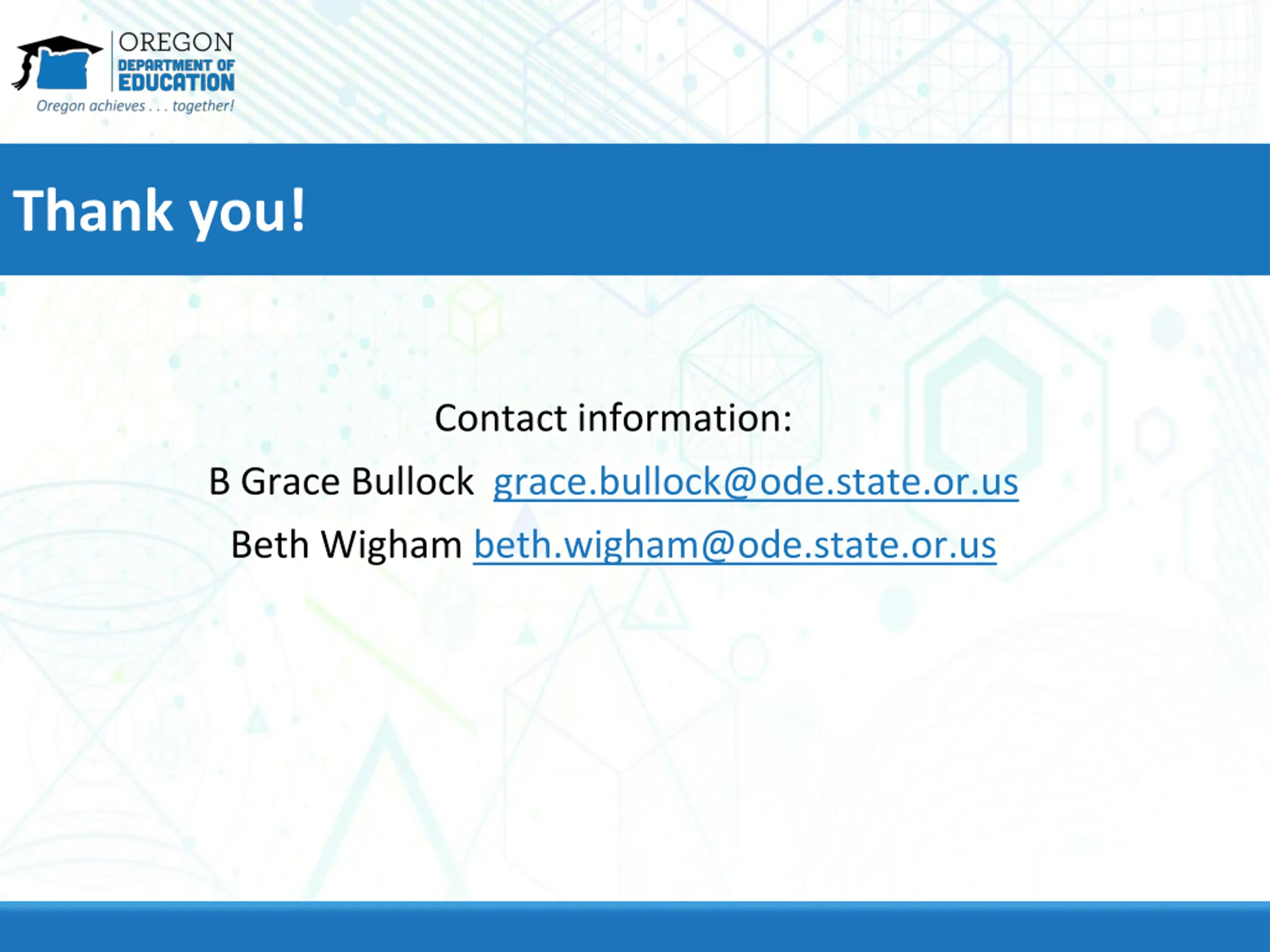 Thank you! Contact information: B Grace Bullock grace.bullock@ode.state.or.us Beth Wigham beth.wigham@ode.state.or.us