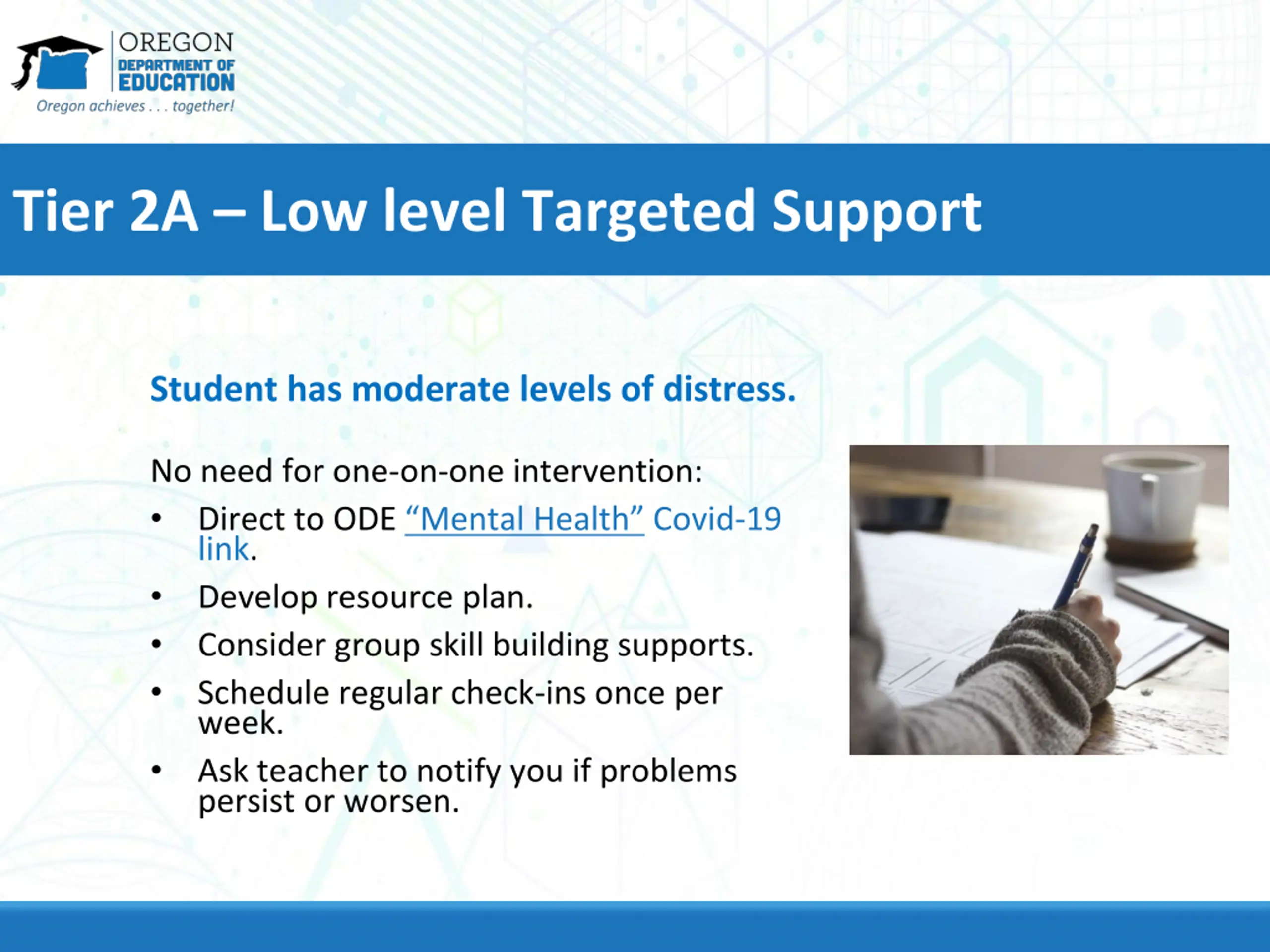 Tier 2A Low level Targeted Support Student has moderate levels of distress. No need for one-on-one intervention: Direct to ODE Mental Health Covid-19 link. Develop resource plan. Consider group skill building supports. Schedule regular check-ins once per week. Ask teacher to notify you if problems persist or worsen.