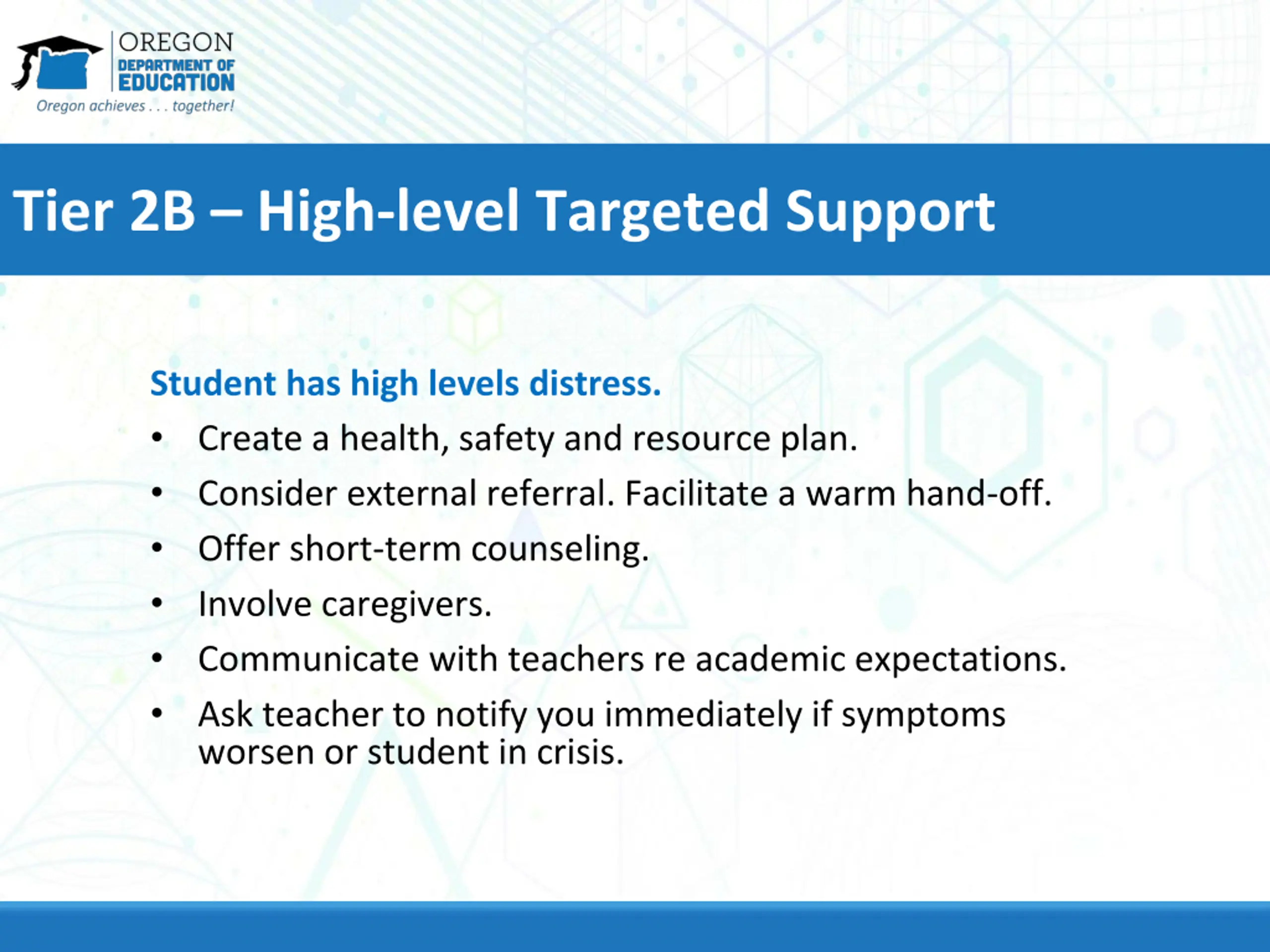 Tier 2B High-level Targeted Support Student has high levels distress. Create a health, safety and resource plan. Consider external referral. Facilitate a warm hand-off. Offer short-term counseling. Involve caregivers. Communicate with teachers re academic expectations. Ask teacher to notify you immediately if symptoms worsen or student in crisis.