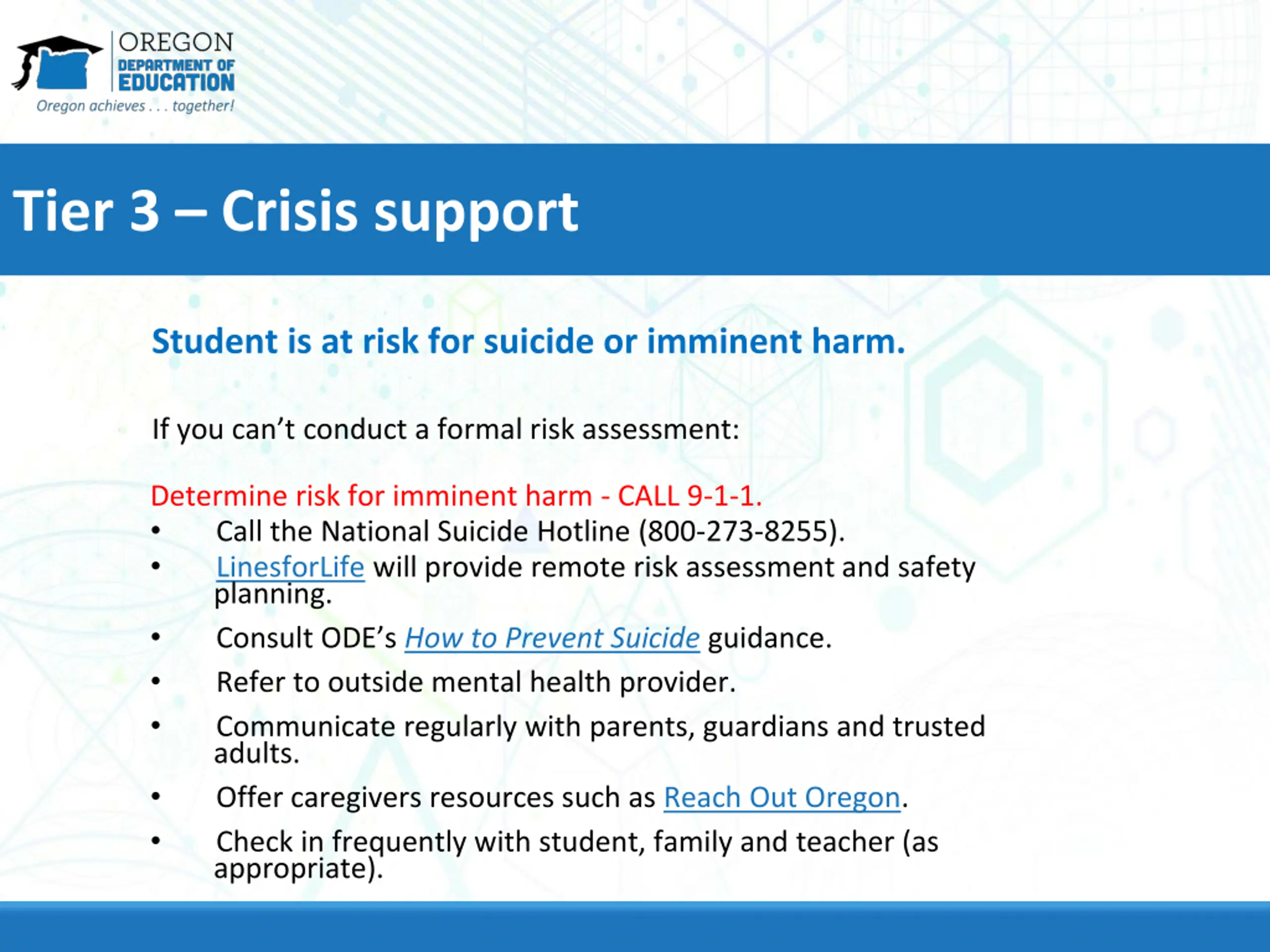 Tier 3 Crisis support Student is at risk for suicide or imminent harm. If you can t conduct a formal risk assessment: Determine risk for imminent harm - CALL 9-1-1. Call the National Suicide Hotline (800-273-8255). LinesforLife will provide remote risk assessment and safety planning. Consult ODE s How to Prevent Suicide guidance. Refer to outside mental health provider. Communicate regularly with parents, guardians and trusted adults. Offer caregivers resources such as Reach Out Oregon. Check in frequently with student, family and teacher (as appropriate).