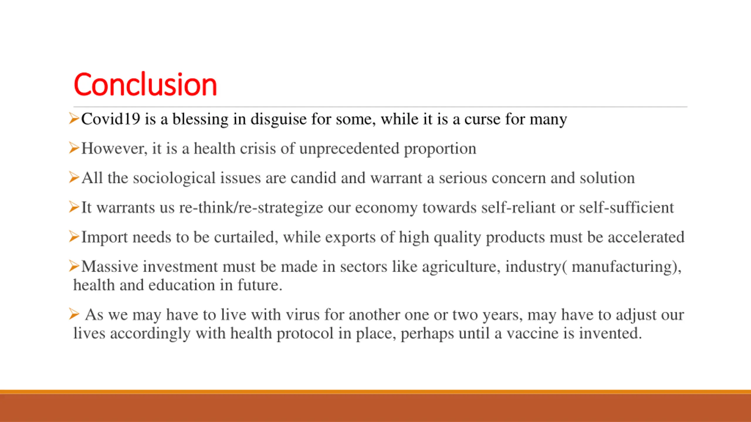 Conclusion Conclusion Covid19 is a blessing in disguise for some, while it is a curse for many However, it is a health crisis of unprecedented proportion All the sociological issues are candid and warrant a serious concern and solution It warrants us re-think/re-strategize our economy towards self-reliant or self-sufficient Import needs to be curtailed, while exports of high quality products must be accelerated Massive investment must be made in sectors like agriculture, industry( manufacturing), health and education in future. As we may have to live with virus for another one or two years, may have to adjust our lives accordingly with health protocol in place, perhaps until a vaccine is invented.