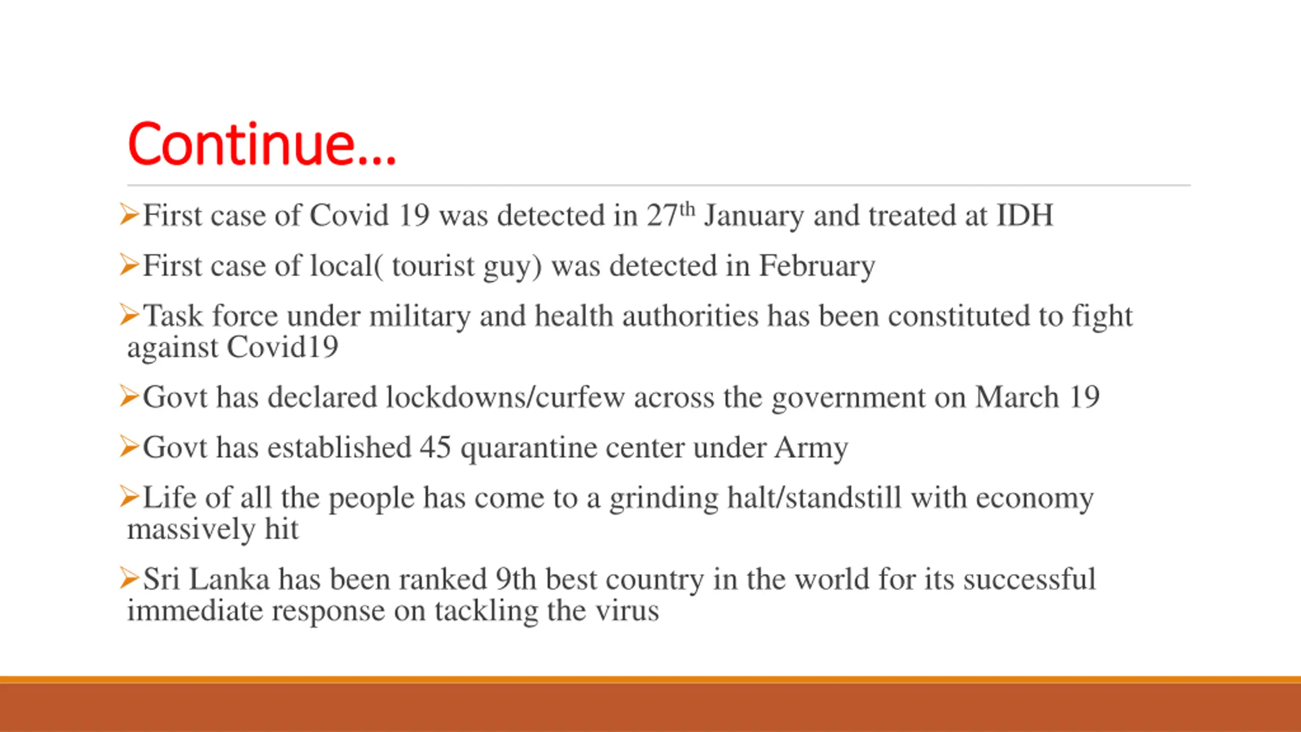 Continue Continue First case of Covid 19 was detected in 27thJanuary and treated at IDH First case of local( tourist guy) was detected in February Task force under military and health authorities has been constituted to fight against Covid19 Govt has declared lockdowns/curfew across the government on March 19 Govt has established 45 quarantine center under Army Life of all the people has come to a grinding halt/standstill with economy massively hit Sri Lanka has been ranked 9th best country in the world for its successful immediate response on tackling the virus