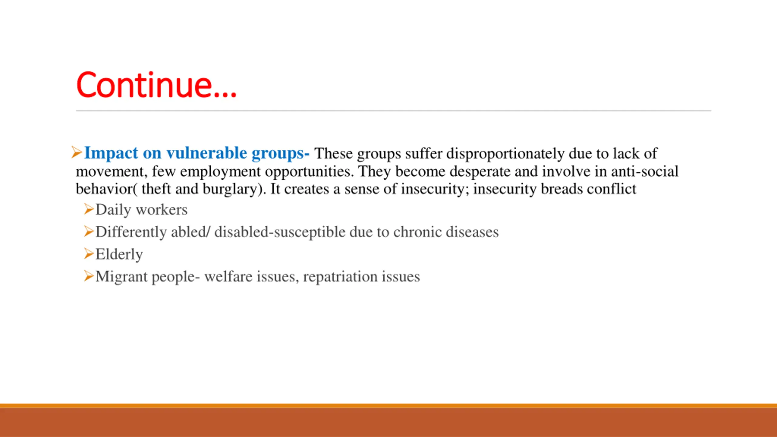 Continue Continue Impact on vulnerable groups- These groups suffer disproportionately due to lack of movement, few employment opportunities. They become desperate and involve in anti-social behavior( theft and burglary). It creates a sense of insecurity; insecurity breads conflict Daily workers Differently abled/ disabled-susceptible due to chronic diseases Elderly Migrant people- welfare issues, repatriation issues