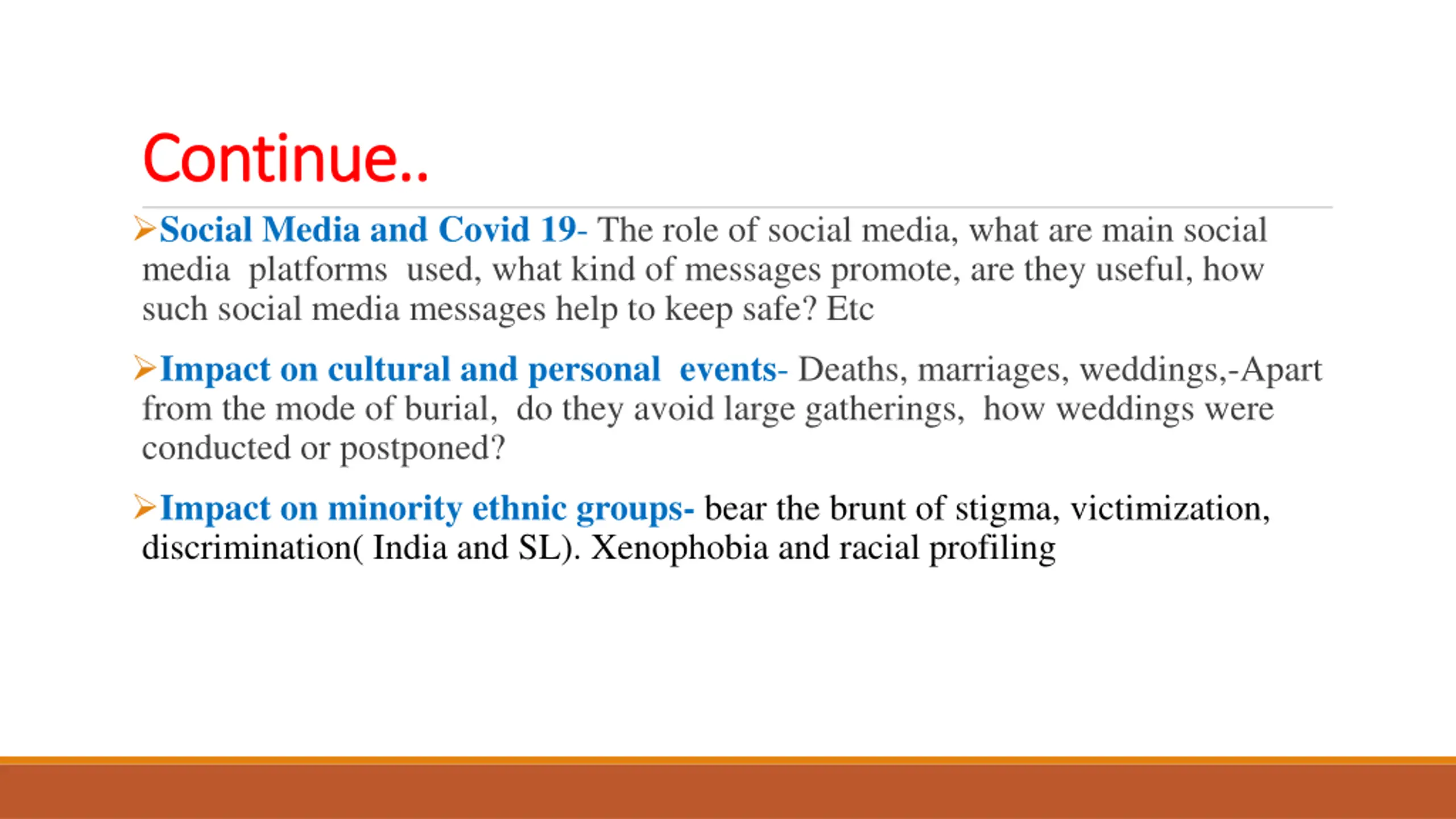 Continue.. Continue.. Social Media and Covid 19- The role of social media, what are main social media platforms used, what kind of messages promote, are they useful, how such social media messages help to keep safe? Etc Impact on cultural and personal events- Deaths, marriages, weddings,-Apart from the mode of burial, do they avoid large gatherings, how weddings were conducted or postponed? Impact on minority ethnic groups- bear the brunt of stigma, victimization, discrimination( India and SL). Xenophobia and racial profiling