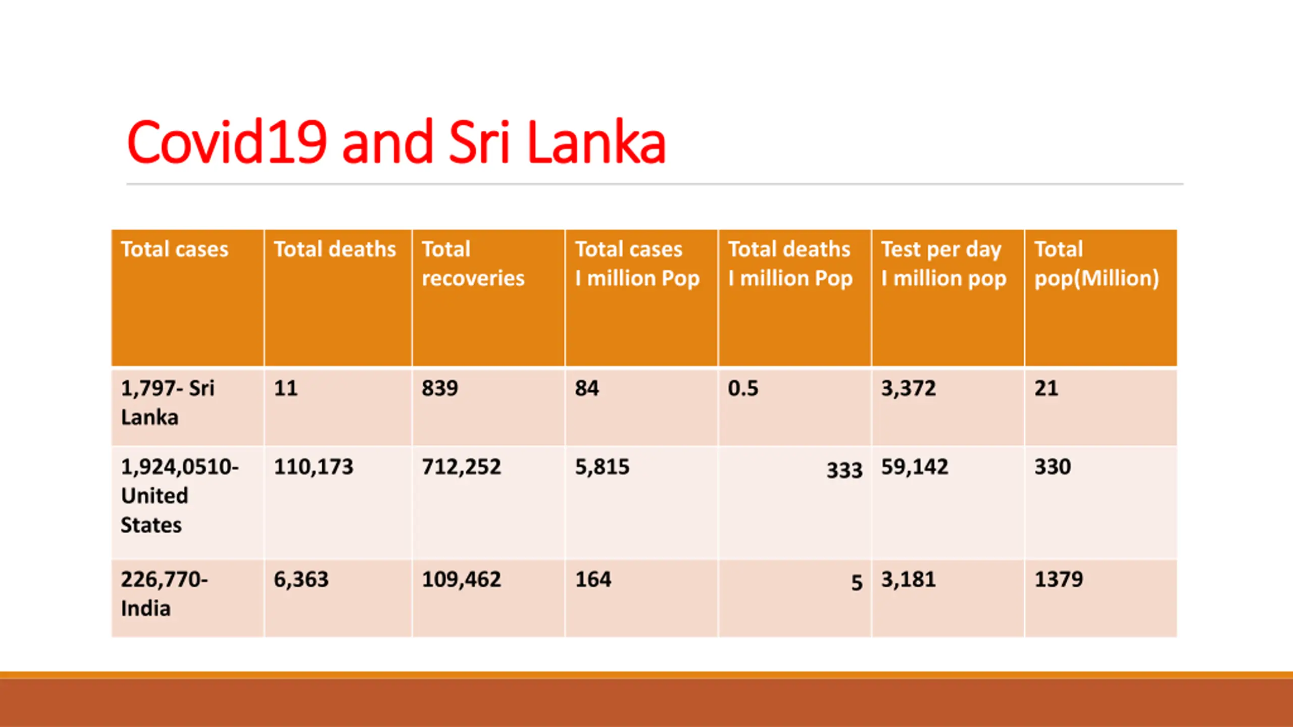 Covid19 and Sri Lanka Covid19 and Sri Lanka Total cases Total deaths Total recoveries Total cases I million Pop Total deaths I million Pop Test per day I million pop Total pop(Million) 1,797- Sri Lanka 11 839 84 0.5 3,372 21 1,924,0510- United States 110,173 712,252 5,815 333 59,142 330 226,770- India 6,363 109,462 164 5 3,181 1379