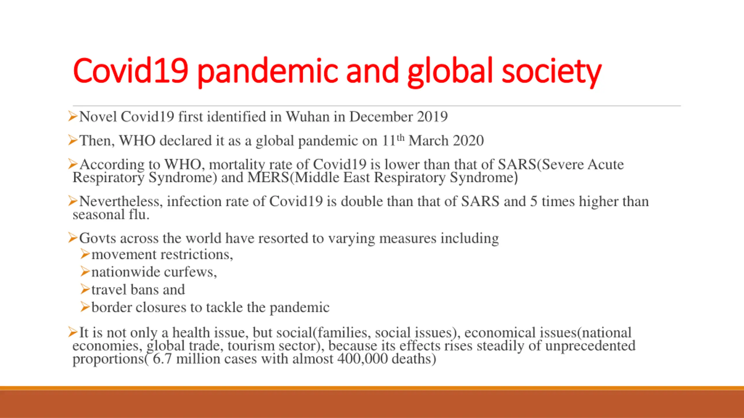 Covid19 pandemic and global society Covid19 pandemic and global society Novel Covid19 first identified in Wuhan in December 2019 Then, WHO declared it as a global pandemic on 11thMarch 2020 According to WHO, mortality rate of Covid19 is lower than that of SARS(Severe Acute Respiratory Syndrome) and MERS(Middle East Respiratory Syndrome) Nevertheless, infection rate of Covid19 is double than that of SARS and 5 times higher than seasonal flu. Govts across the world have resorted to varying measures including movement restrictions, nationwide curfews, travel bans and border closures to tackle the pandemic It is not only a health issue, but social(families, social issues), economical issues(national economies, global trade, tourism sector), because its effects rises steadily of unprecedented proportions( 6.7 million cases with almost 400,000 deaths)