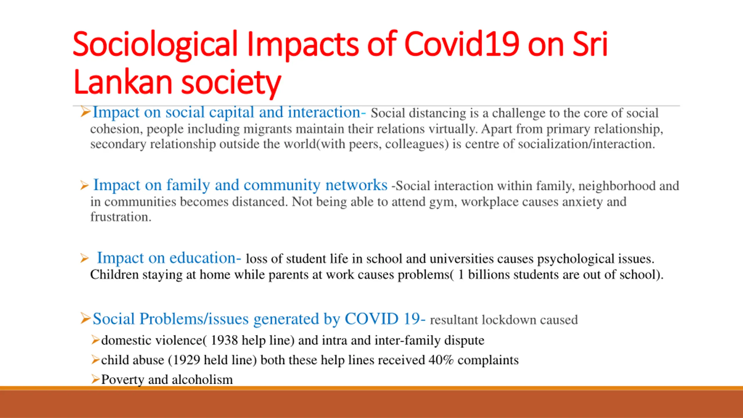 Sociological Impacts of Covid19 on Sri Sociological Impacts of Covid19 on Sri Lankan society Lankan society Impact on social capital and interaction- Social distancing is a challenge to the core of social cohesion, people including migrants maintain their relations virtually. Apart from primary relationship, secondary relationship outside the world(with peers, colleagues) is centre of socialization/interaction. Impact on family and community networks -Social interaction within family, neighborhood and in communities becomes distanced. Not being able to attend gym, workplace causes anxiety and frustration. Impact on education- loss of student life in school and universities causes psychological issues. Children staying at home while parents at work causes problems( 1 billions students are out of school). Social Problems/issues generated by COVID 19- resultant lockdown caused domestic violence( 1938 help line) and intra and inter-family dispute child abuse (1929 held line) both these help lines received 40% complaints Poverty and alcoholism
