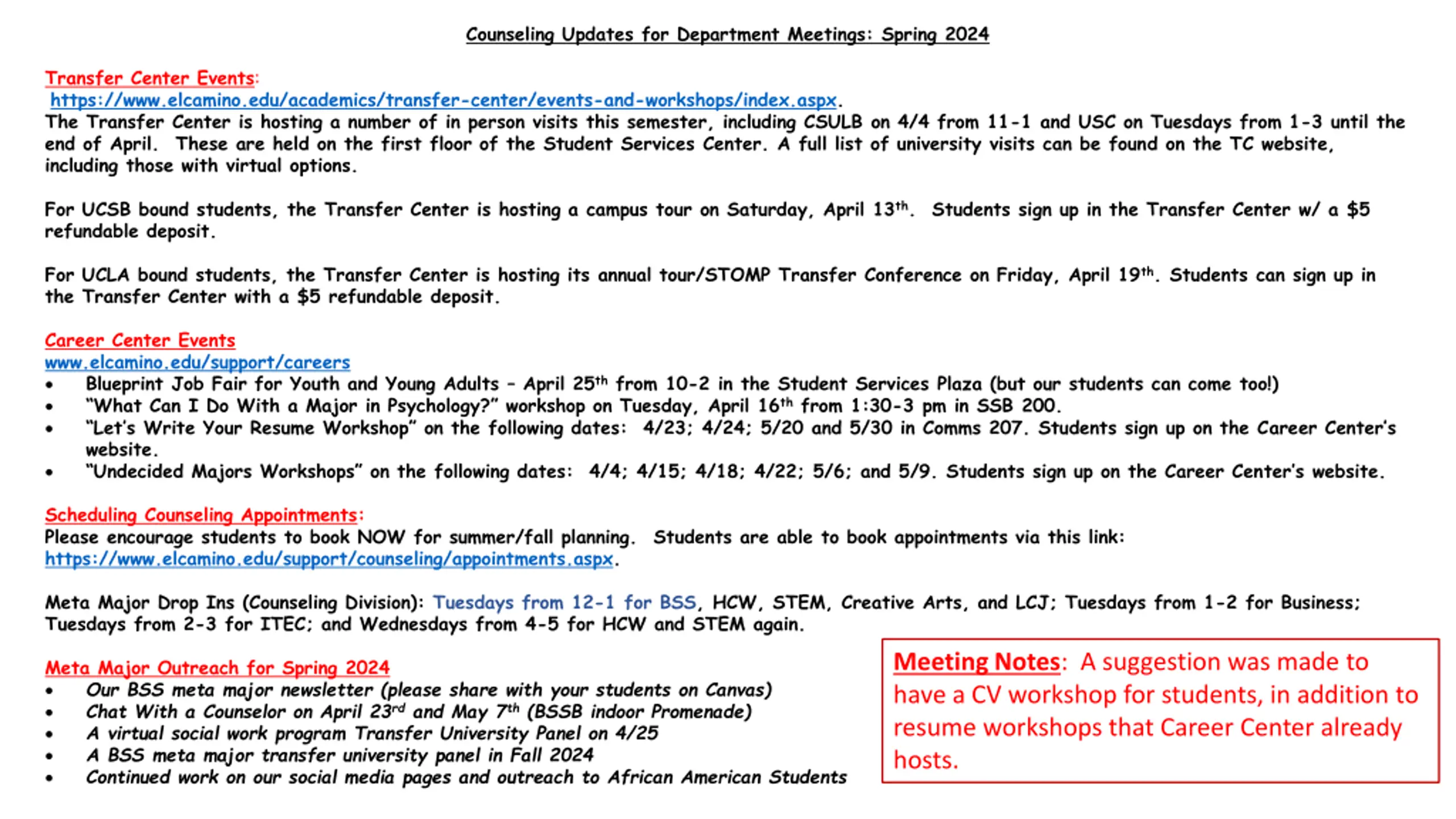 Counseling Updates for Department Meetings: Spring 2024 Transfer Center Events: https://www.elcamino.edu/academics/transfer-center/events-and-workshops/index.aspx. The Transfer Center is hosting a number of in person visits this semester, including CSULB on 4/4 from 11-1 and USC on Tuesdays from 1-3 until the end of April. These are held on the first floor of the Student Services Center. A full list of university visits can be found on the TC website, including those with virtual options. For UCSB bound students, the Transfer Center is hosting a campus tour on Saturday, April 13th. Students sign up in the Transfer Center w/ a $5 refundable deposit. For UCLA bound students, the Transfer Center is hosting its annual tour/STOMP Transfer Conference on Friday, April 19th. Students can sign up in the Transfer Center with a $5 refundable deposit. Career Center Events www.elcamino.edu/support/careers Blueprint Job Fair for Youth and Young Adults April 25th from 10-2 in the Student Services Plaza (but our students can come too!) What Can I Do With a Major in Psychology? workshop on Tuesday, April 16th from 1:30-3 pm in SSB 200. Let s Write Your Resume Workshop on the following dates: 4/23; 4/24; 5/20 and 5/30 in Comms 207. Students sign up on the Career Center s website. Undecided Majors Workshops on the following dates: 4/4; 4/15; 4/18; 4/22; 5/6; and 5/9. Students sign up on the Career Center s website. Scheduling Counseling Appointments: Please encourage students to book NOW for summer/fall planning. Students are able to book appointments via this link: https://www.elcamino.edu/support/counseling/appointments.aspx. Meta Major Drop Ins (Counseling Division): Tuesdays from 12-1 for BSS, HCW, STEM, Creative Arts, and LCJ; Tuesdays from 1-2 for Business; Tuesdays from 2-3 for ITEC; and Wednesdays from 4-5 for HCW and STEM again. Meeting Notes: A suggestion was made to have a CV workshop for students, in addition to resume workshops that Career Center already hosts. Meta Major Outreach for Spring 2024 Our BSS meta major newsletter (please share with your students on Canvas) Chat With a Counselor on April 23rd and May 7th (BSSB indoor Promenade) A virtual social work program Transfer University Panel on 4/25 A BSS meta major transfer university panel in Fall 2024 Continued work on our social media pages and outreach to African American Students