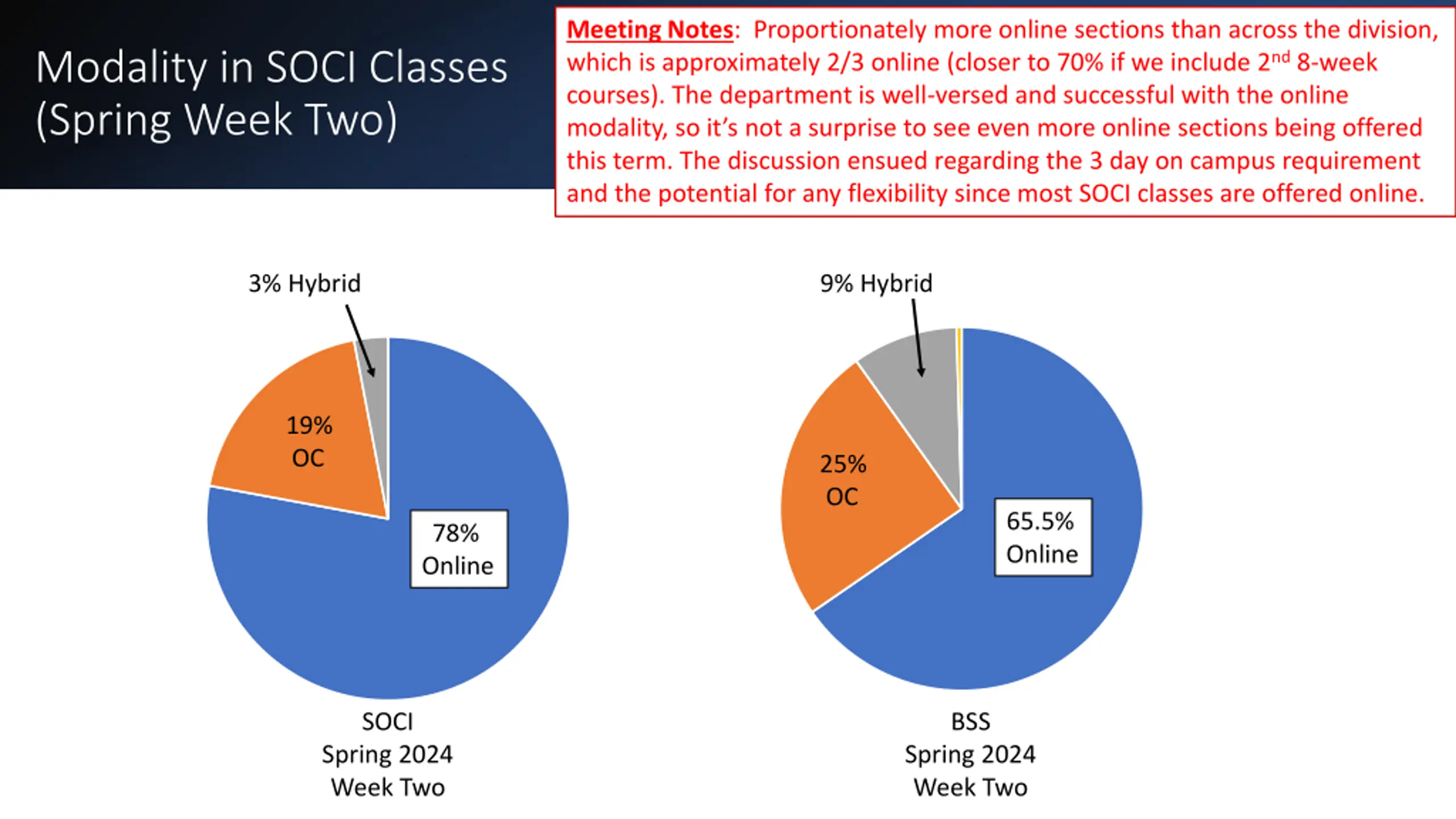 Meeting Notes: Proportionately more online sections than across the division, which is approximately 2/3 online (closer to 70% if we include 2nd 8-week courses). The department is well-versed and successful with the online modality, so it s not a surprise to see even more online sections being offered this term. The discussion ensued regarding the 3 day on campus requirement and the potential for any flexibility since most SOCI classes are offered online. Modality in SOCI Classes (Spring Week Two) 3% Hybrid 9% Hybrid 19% OC 25% OC 65.5% Online 78% Online SOCI BSS Spring 2024 Week Two Spring 2024 Week Two