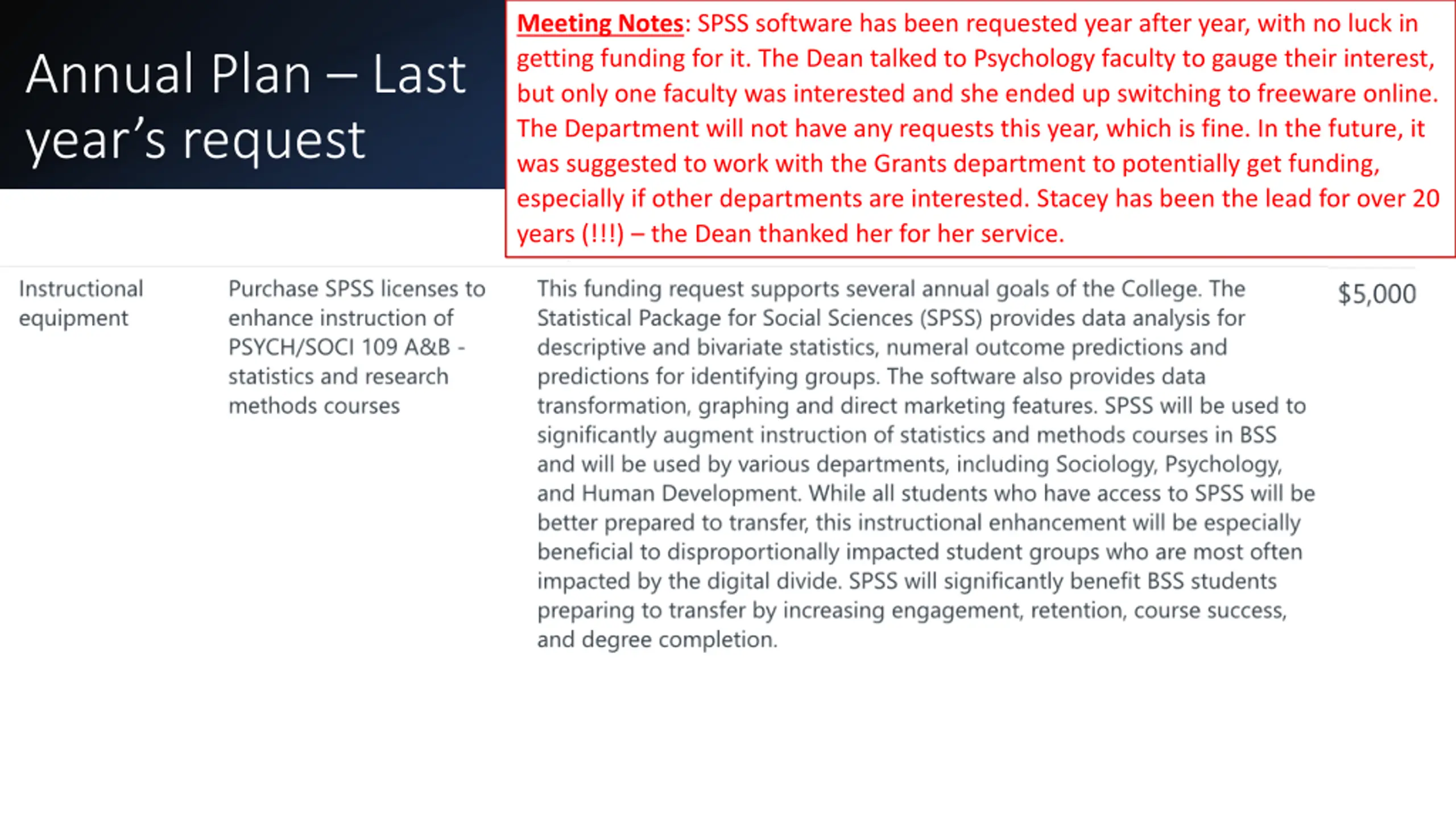 Meeting Notes: SPSS software has been requested year after year, with no luck in getting funding for it. The Dean talked to Psychology faculty to gauge their interest, but only one faculty was interested and she ended up switching to freeware online. The Department will not have any requests this year, which is fine. In the future, it was suggested to work with the Grants department to potentially get funding, especially if other departments are interested. Stacey has been the lead for over 20 years (!!!) the Dean thanked her for her service. Annual Plan Last year s request