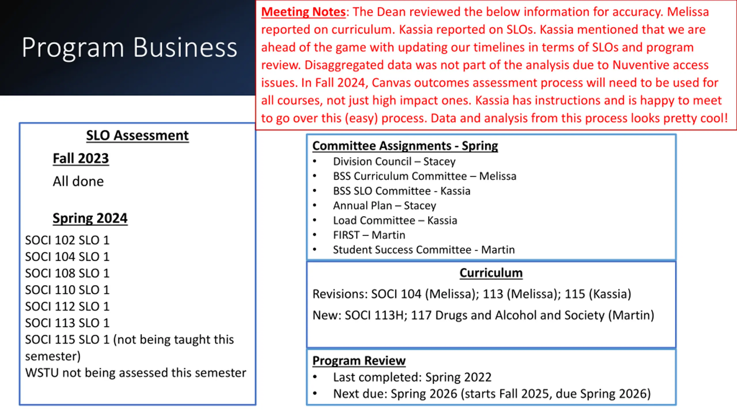 Meeting Notes: The Dean reviewed the below information for accuracy. Melissa reported on curriculum. Kassia reported on SLOs. Kassia mentioned that we are ahead of the game with updating our timelines in terms of SLOs and program review. Disaggregated data was not part of the analysis due to Nuventive access issues. In Fall 2024, Canvas outcomes assessment process will need to be used for all courses, not just high impact ones. Kassia has instructions and is happy to meet to go over this (easy) process. Data and analysis from this process looks pretty cool! Program Business SLO Assessment Fall 2023 All done Committee Assignments - Spring Division Council Stacey BSS Curriculum Committee Melissa BSS SLO Committee - Kassia Annual Plan Stacey Load Committee Kassia FIRST Martin Student Success Committee - Martin Spring 2024 SOCI 102 SLO 1 SOCI 104 SLO 1 SOCI 108 SLO 1 SOCI 110 SLO 1 SOCI 112 SLO 1 SOCI 113 SLO 1 SOCI 115 SLO 1 (not being taught this semester) WSTU not being assessed this semester Curriculum Revisions: SOCI 104 (Melissa); 113 (Melissa); 115 (Kassia) New: SOCI 113H; 117 Drugs and Alcohol and Society (Martin) Program Review Last completed: Spring 2022 Next due: Spring 2026 (starts Fall 2025, due Spring 2026)