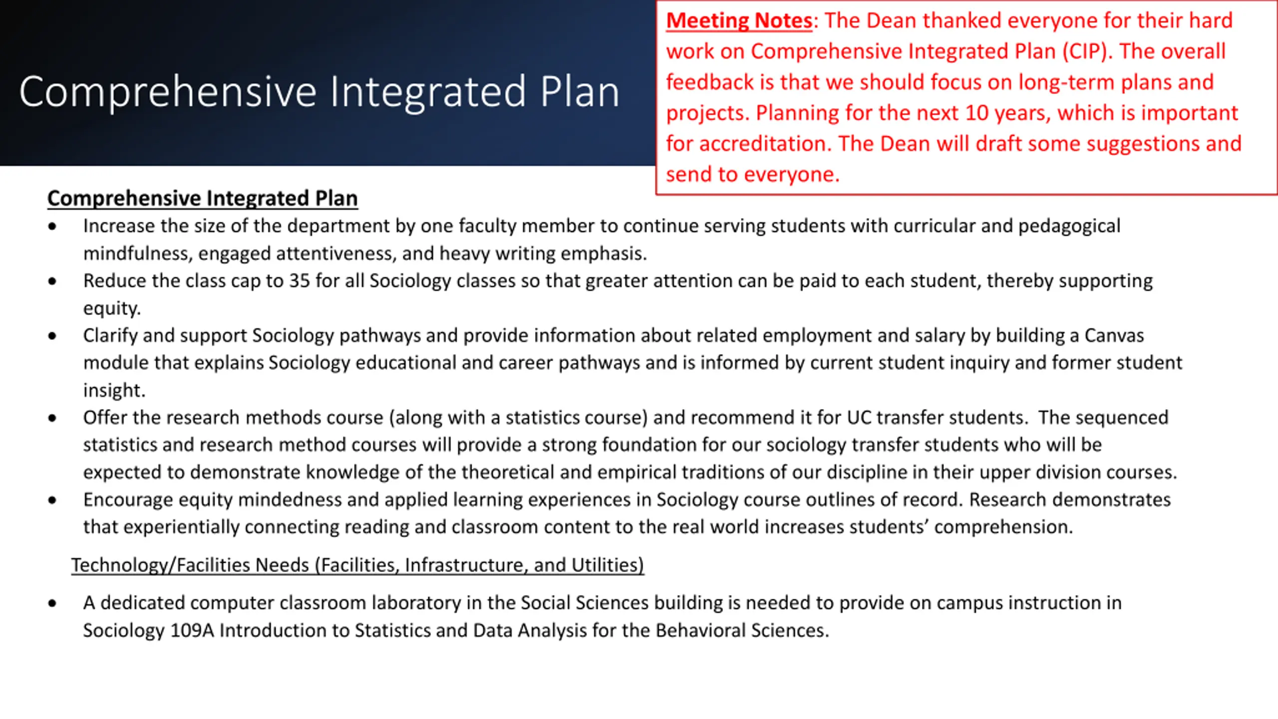 Meeting Notes: The Dean thanked everyone for their hard work on Comprehensive Integrated Plan (CIP). The overall feedback is that we should focus on long-term plans and projects. Planning for the next 10 years, which is important for accreditation. The Dean will draft some suggestions and send to everyone. Comprehensive Integrated Plan Comprehensive Integrated Plan Increase the size of the department by one faculty member to continue serving students with curricular and pedagogical mindfulness, engaged attentiveness, and heavy writing emphasis. Reduce the class cap to 35 for all Sociology classes so that greater attention can be paid to each student, thereby supporting equity. Clarify and support Sociology pathways and provide information about related employment and salary by building a Canvas module that explains Sociology educational and career pathways and is informed by current student inquiry and former student insight. Offer the research methods course (along with a statistics course) and recommend it for UC transfer students. The sequenced statistics and research method courses will provide a strong foundation for our sociology transfer students who will be expected to demonstrate knowledge of the theoretical and empirical traditions of our discipline in their upper division courses. Encourage equity mindedness and applied learning experiences in Sociology course outlines of record. Research demonstrates that experientially connecting reading and classroom content to the real world increases students comprehension. Technology/Facilities Needs (Facilities, Infrastructure, and Utilities) A dedicated computer classroom laboratory in the Social Sciences building is needed to provide on campus instruction in Sociology 109A Introduction to Statistics and Data Analysis for the Behavioral Sciences.