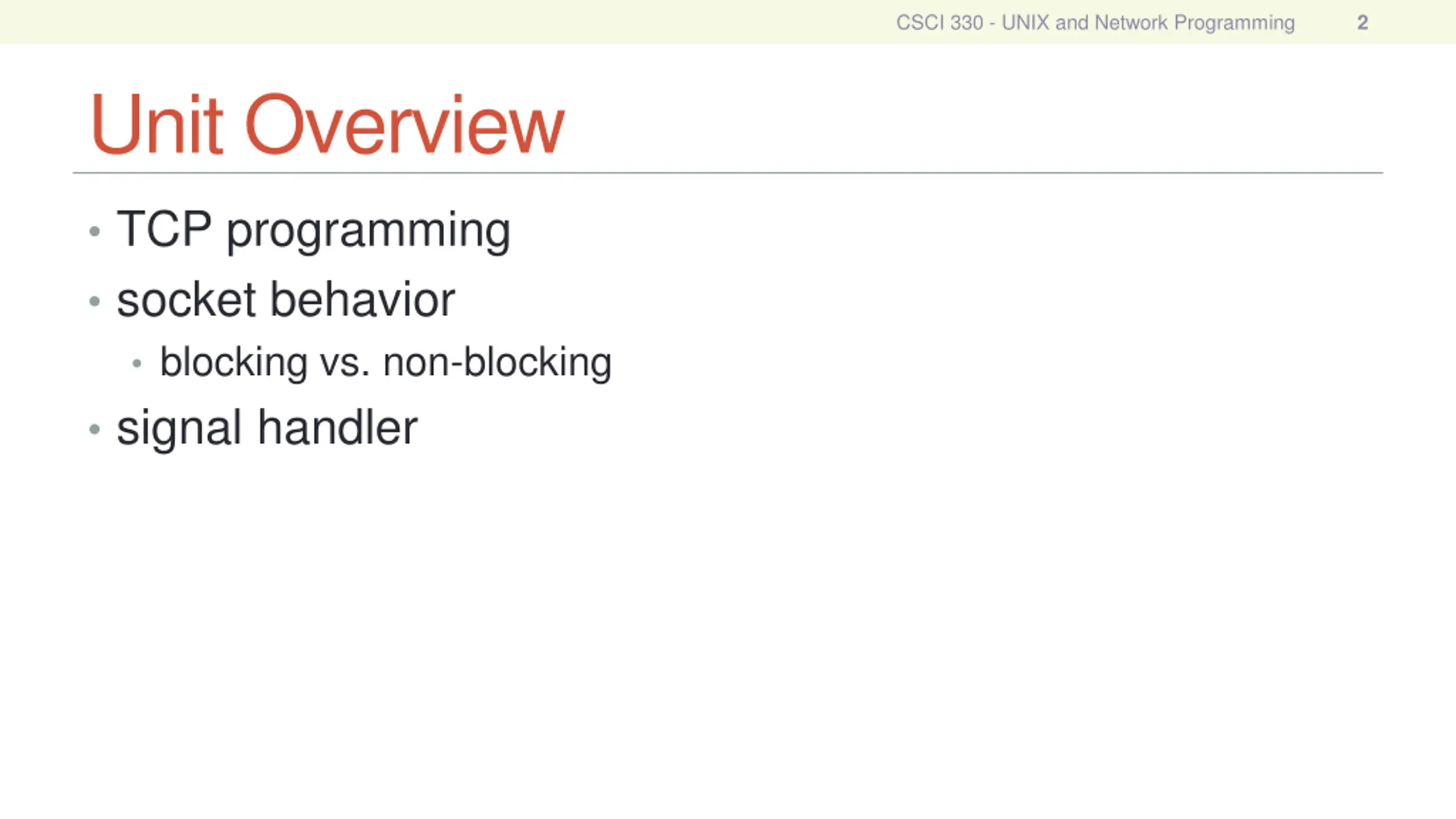 CSCI 330 - UNIX and Network Programming 2 Unit Overview TCP programming socket behavior blocking vs. non-blocking signal handler