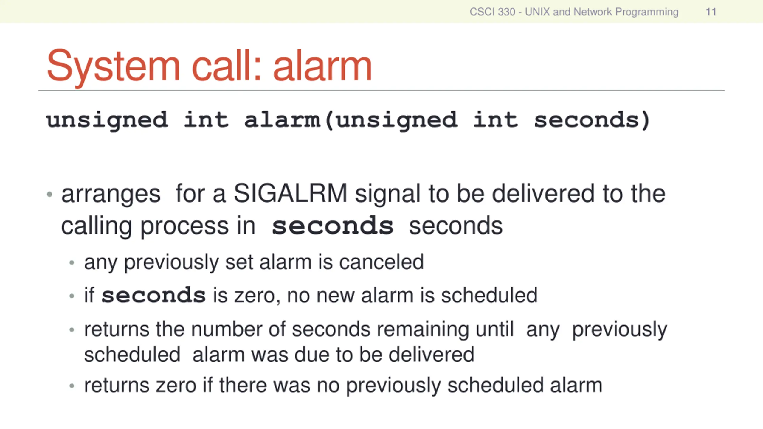CSCI 330 - UNIX and Network Programming 10 System call: alarm
