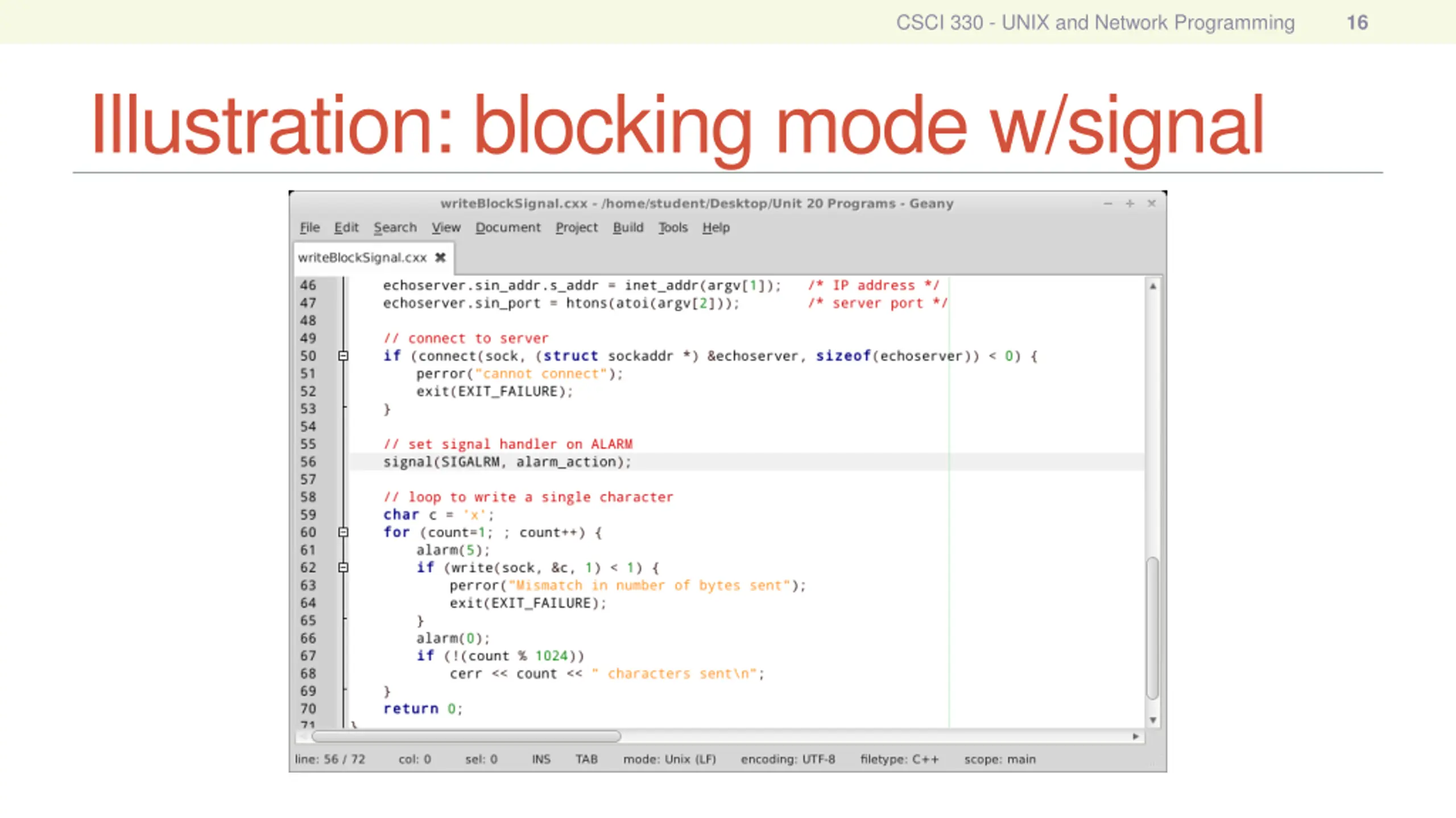 CSCI 330 - UNIX and Network Programming 15 Signal handler: detail void alarm_action(int s) { cerr << "write blocked after " << count << " characters\n"; exit(EXIT_SUCCESS); } // set signal handler on ALARM signal(SIGALRM, alarm_action);