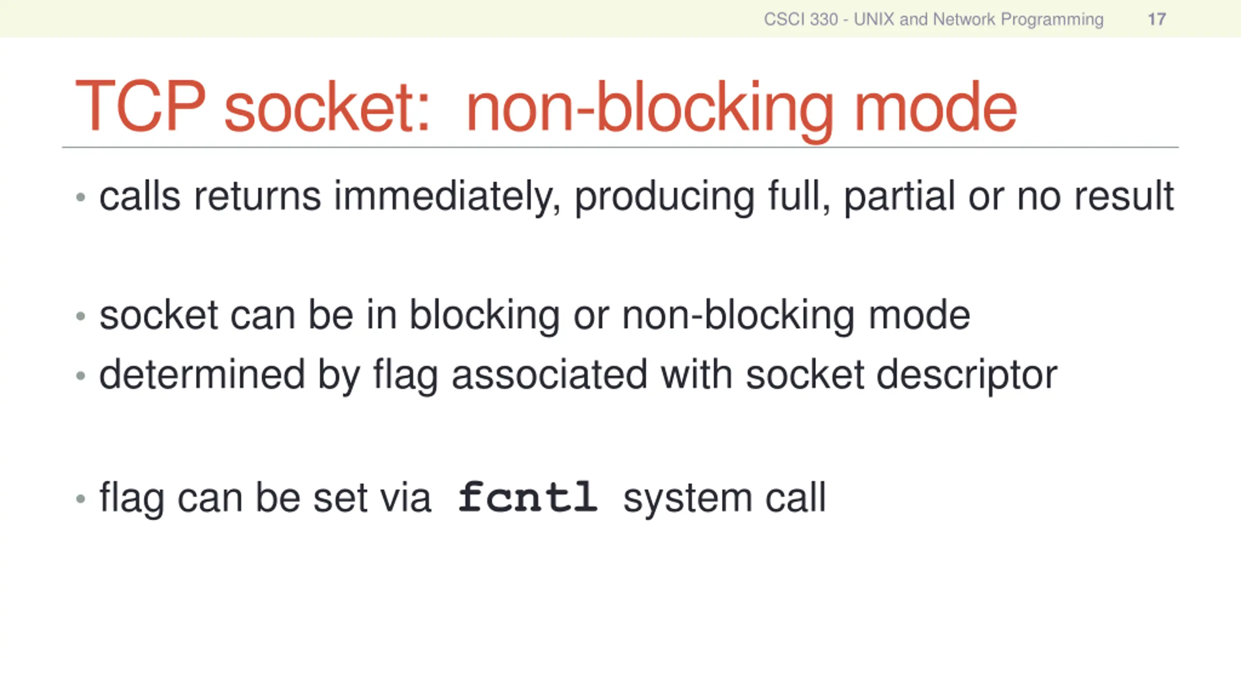 CSCI 330 - UNIX and Network Programming 17 TCP socket: non-blocking mode calls returns immediately, producing full, partial or no result socket can be in blocking or non-blocking mode determined by flag associated with socket descriptor flag can be set via fcntl system call