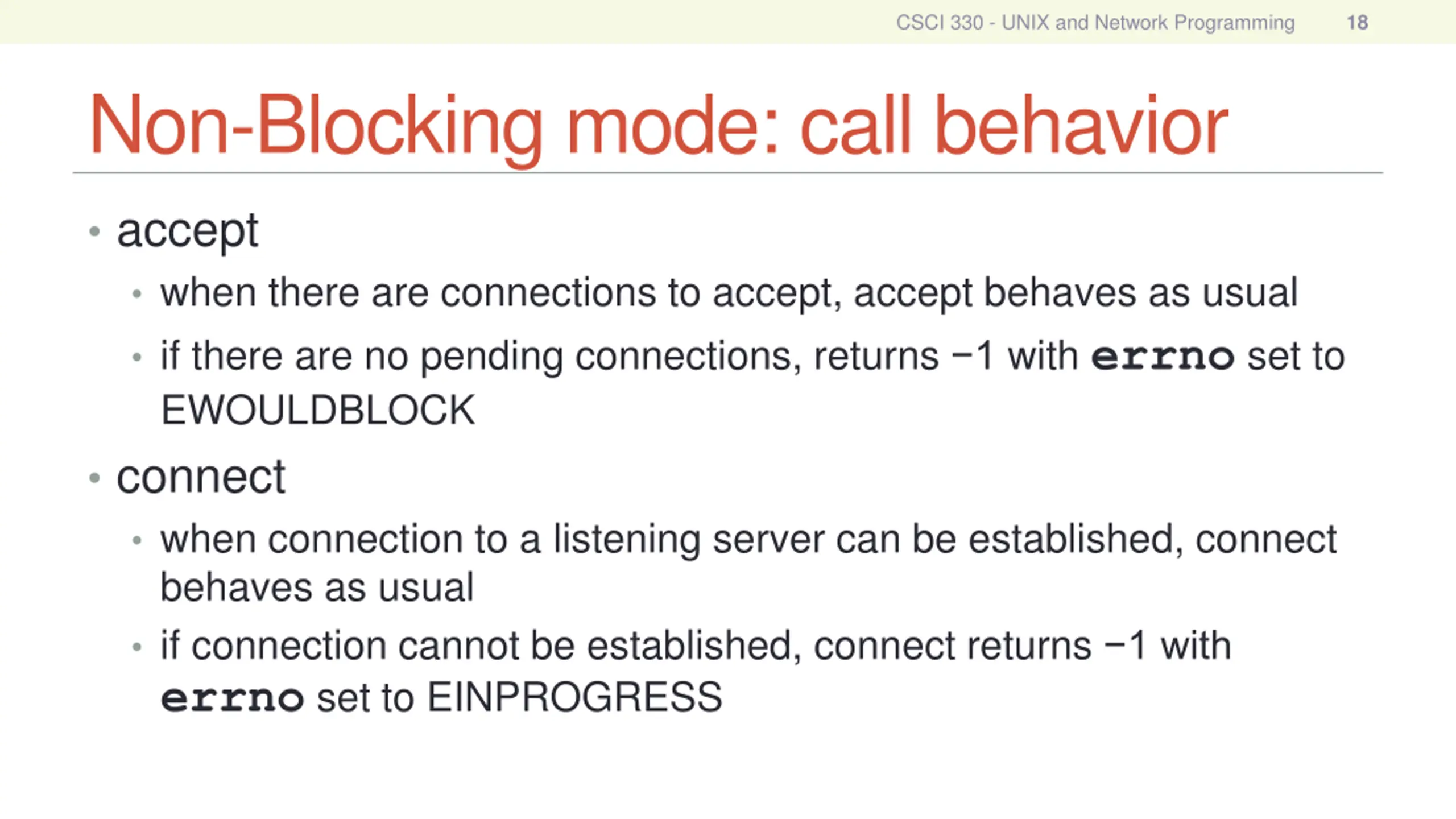 CSCI 330 - UNIX and Network Programming 18 Non-Blocking mode: call behavior accept when there are connections to accept, accept behaves as usual if there are no pending connections, returns 1 with errno set to EWOULDBLOCK connect when connection to a listening server can be established, connect behaves as usual if connection cannot be established, connect returns 1 with errno set to EINPROGRESS