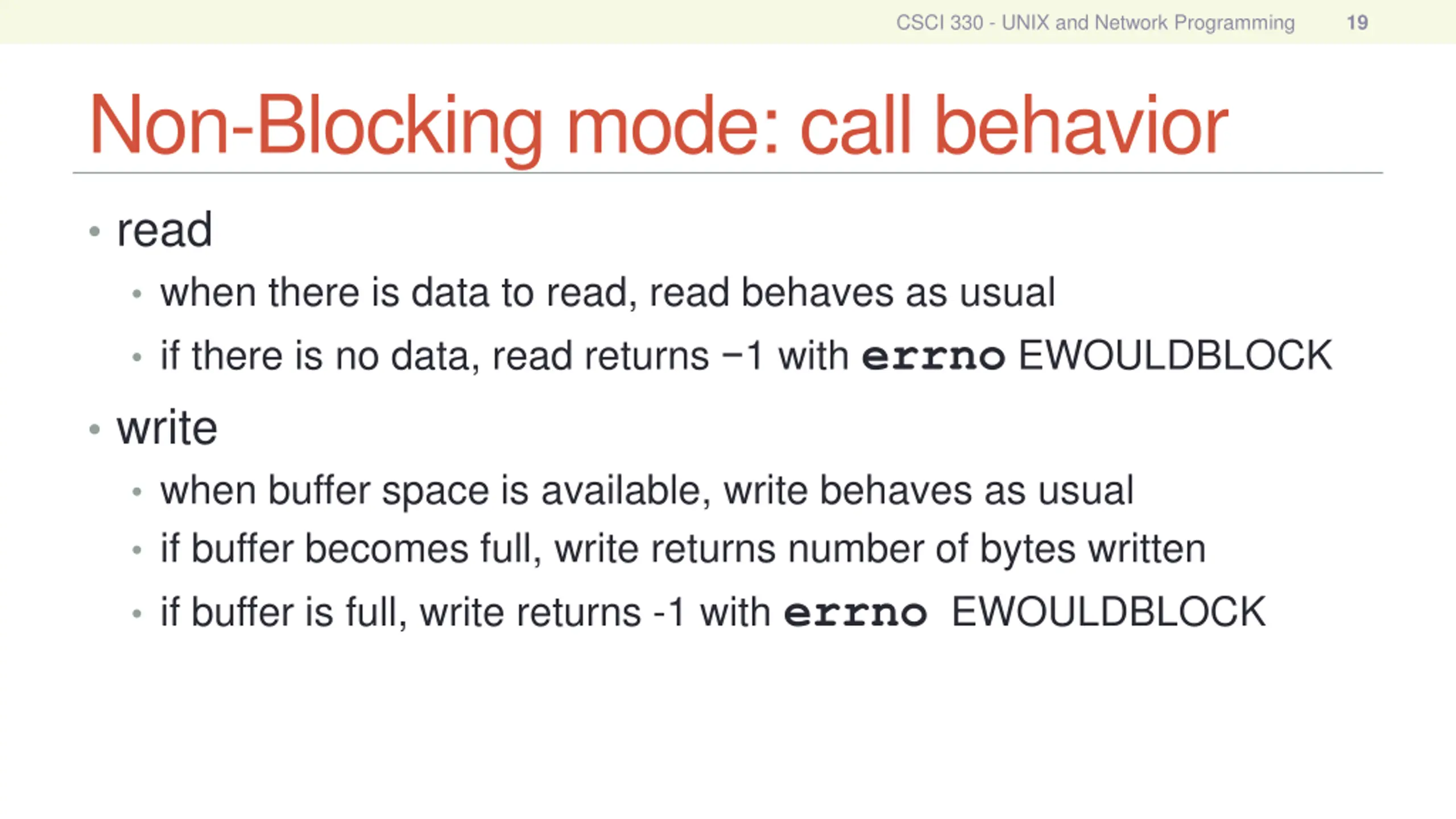 CSCI 330 - UNIX and Network Programming 19 Non-Blocking mode: call behavior read when there is data to read, read behaves as usual if there is no data, read returns 1 with errno EWOULDBLOCK write when buffer space is available, write behaves as usual if buffer becomes full, write returns number of bytes written if buffer is full, write returns -1 with errno EWOULDBLOCK