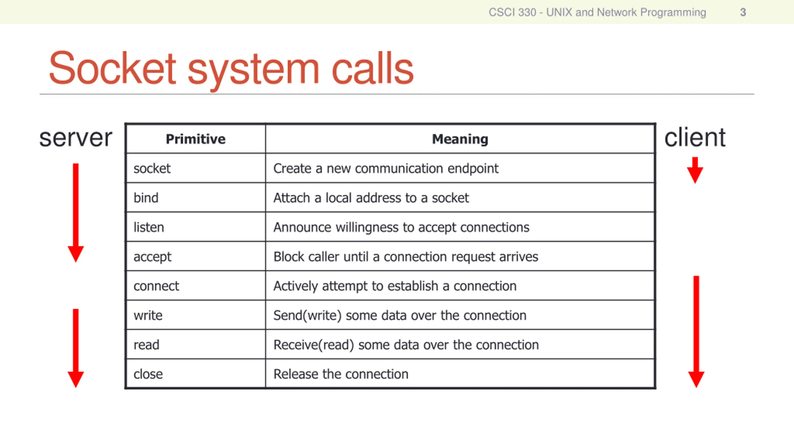 CSCI 330 - UNIX and Network Programming 3 Socket system calls client server Primitive Meaning socket Create a new communication endpoint bind Attach a local address to a socket listen Announce willingness to accept connections accept Block caller until a connection request arrives connect Actively attempt to establish a connection write Send(write) some data over the connection read Receive(read) some data over the connection close Release the connection