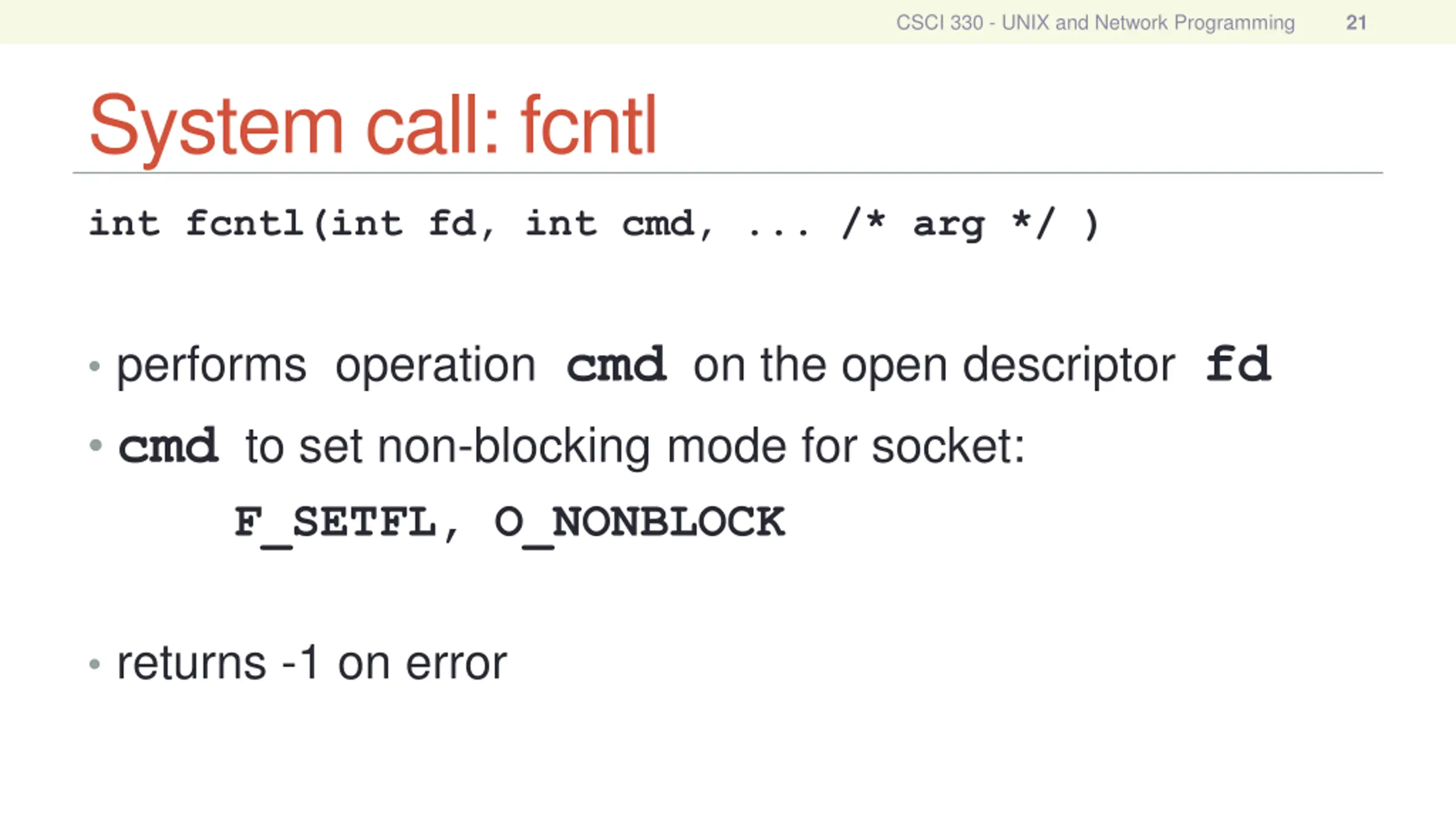 CSCI 330 - UNIX and Network Programming 21 System call: fcntl int fcntl(int fd, int cmd, ... /* arg */ ) performs operation cmd on the open descriptor fd cmd to set non-blocking mode for socket: F_SETFL, O_NONBLOCK returns -1 on error