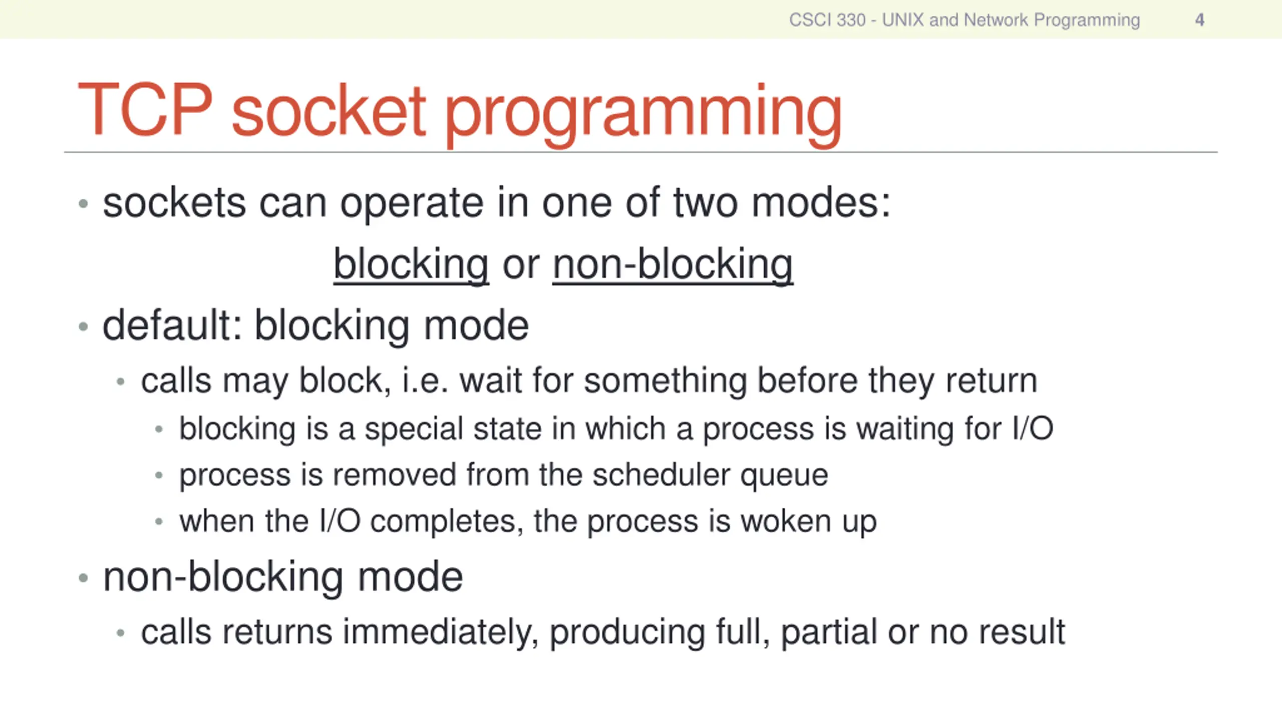 CSCI 330 - UNIX and Network Programming 4 TCP socket programming sockets can operate in one of two modes: blocking or non-blocking default: blocking mode calls may block, i.e. wait for something before they return blocking is a special state in which a process is waiting for I/O process is removed from the scheduler queue when the I/O completes, the process is woken up non-blocking mode calls returns immediately, producing full, partial or no result