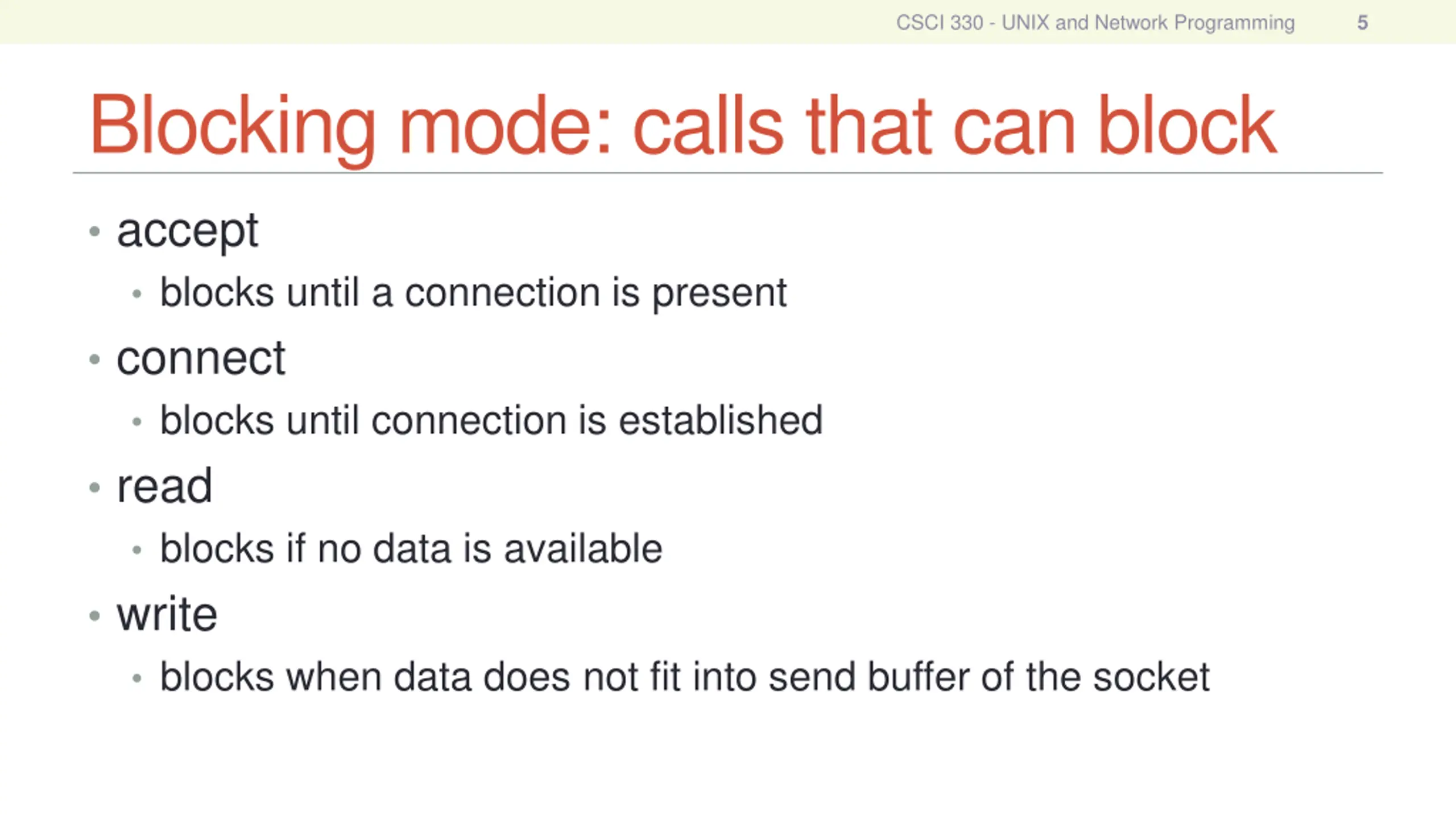 CSCI 330 - UNIX and Network Programming 5 Blocking mode: calls that can block accept blocks until a connection is present connect blocks until connection is established read blocks if no data is available write blocks when data does not fit into send buffer of the socket