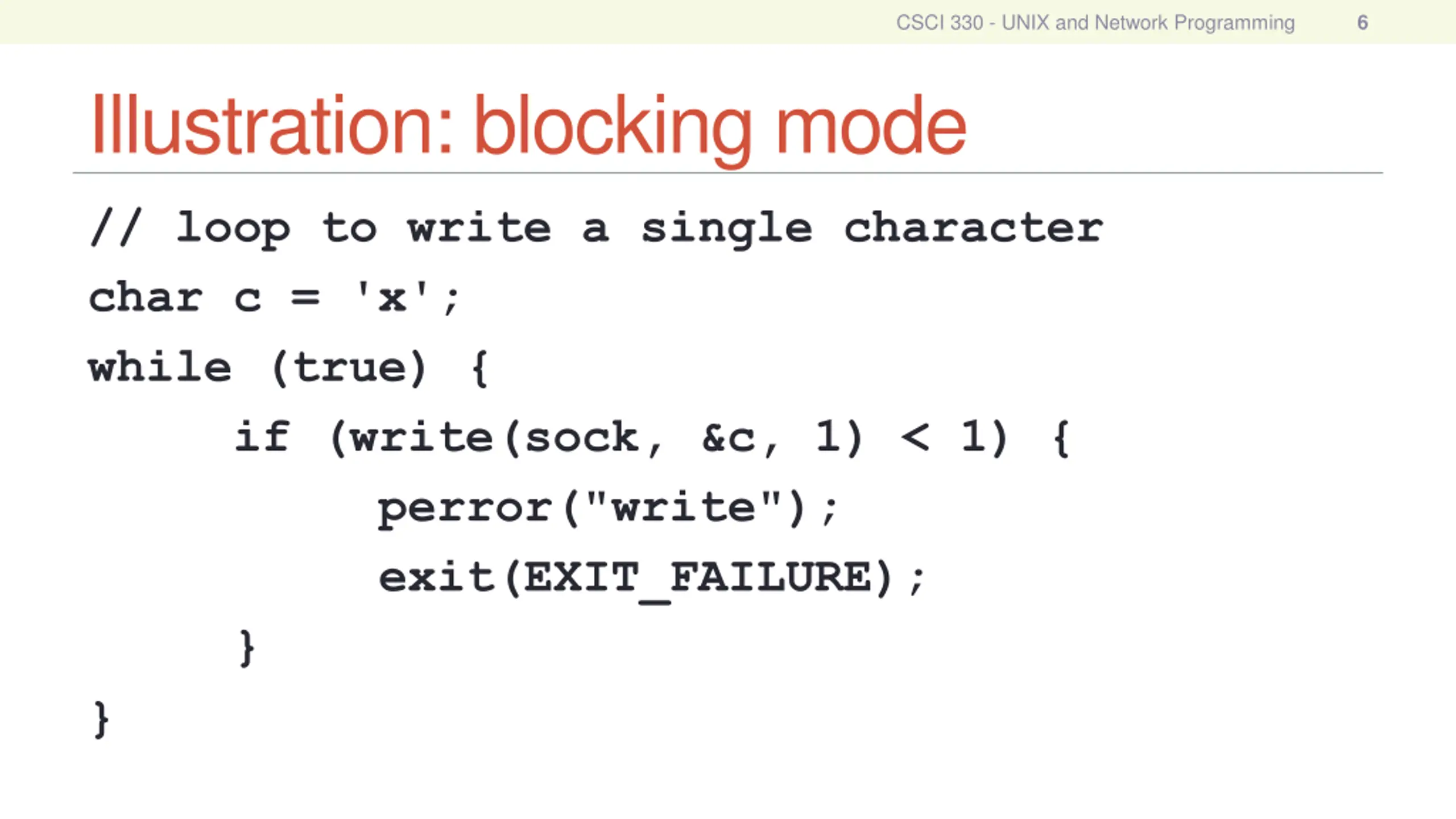 CSCI 330 - UNIX and Network Programming 6 Illustration: blocking mode // loop to write a single character char c = 'x'; while (true) { if (write(sock, &c, 1) < 1) { perror("write"); exit(EXIT_FAILURE); } }
