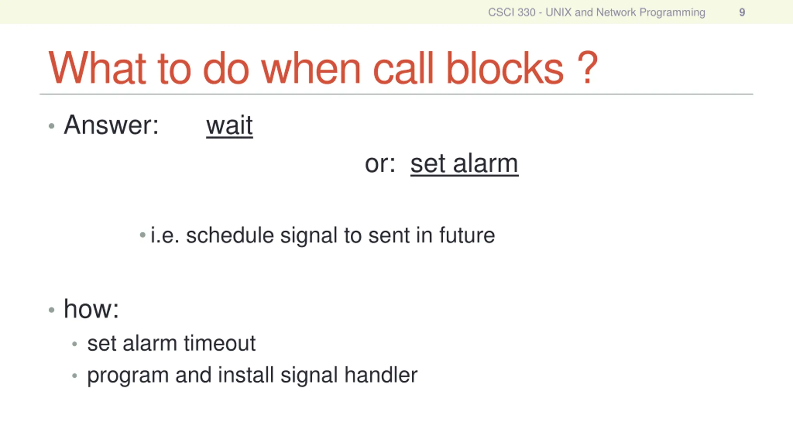 CSCI 330 - UNIX and Network Programming 9 What to do when call blocks ? Answer: wait or: set alarm i.e. schedule signal to sent in future how: set alarm timeout program and install signal handler