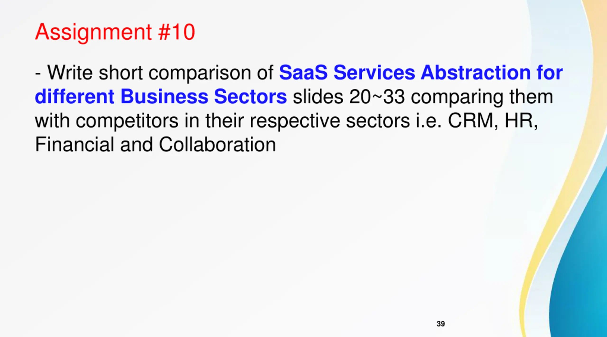 Assignment #10 - Write short comparison of SaaS Services Abstraction for different Business Sectors slides 20~33 comparing them with competitors in their respective sectors i.e. CRM, HR, Financial and Collaboration 39