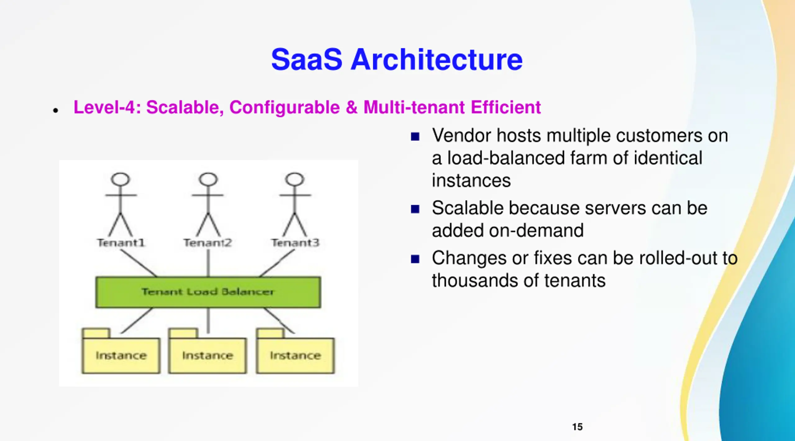 SaaS Architecture Level-4: Scalable, Configurable & Multi-tenant Efficient Vendor hosts multiple customers on a load-balanced farm of identical instances Scalable because servers can be added on-demand Changes or fixes can be rolled-out to thousands of tenants 15