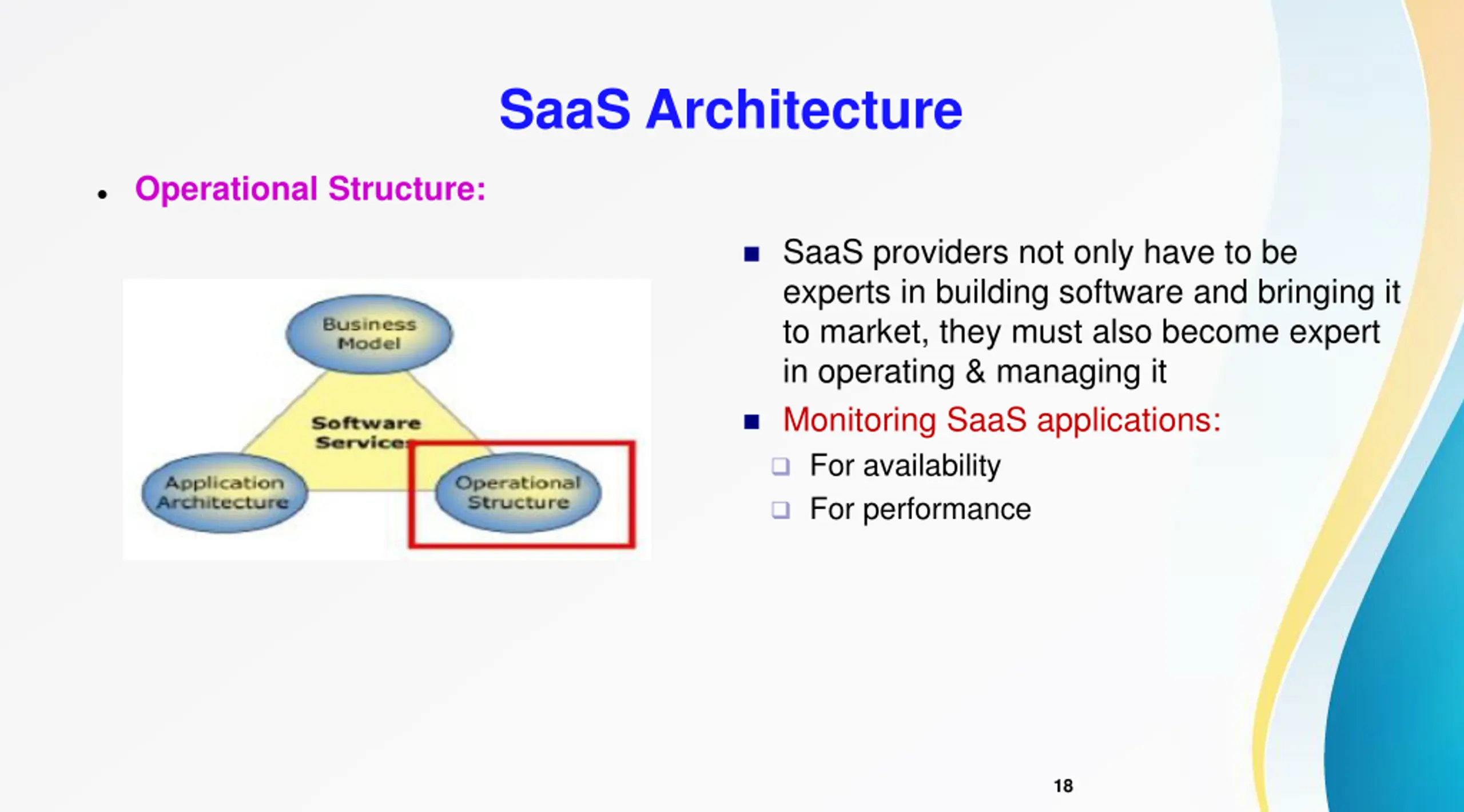 SaaS Architecture Operational Structure: SaaS providers not only have to be experts in building software and bringing it to market, they must also become expert in operating & managing it Monitoring SaaS applications: For availability For performance 18