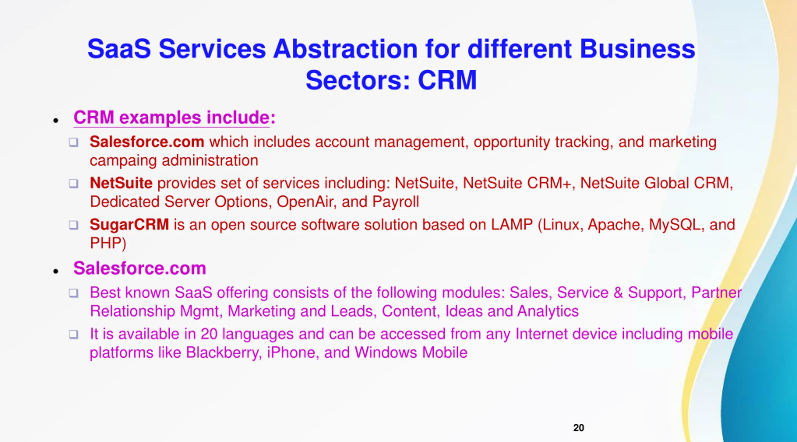 SaaS Services Abstraction for different Business Sectors: CRM CRM examples include: Salesforce.com which includes account management, opportunity tracking, and marketing campaing administration NetSuite provides set of services including: NetSuite, NetSuite CRM+, NetSuite Global CRM, Dedicated Server Options, OpenAir, and Payroll SugarCRM is an open source software solution based on LAMP (Linux, Apache, MySQL, and PHP) Salesforce.com Best known SaaS offering consists of the following modules: Sales, Service & Support, Partner Relationship Mgmt, Marketing and Leads, Content, Ideas and Analytics It is available in 20 languages and can be accessed from any Internet device including mobile platforms like Blackberry, iPhone, and Windows Mobile 20