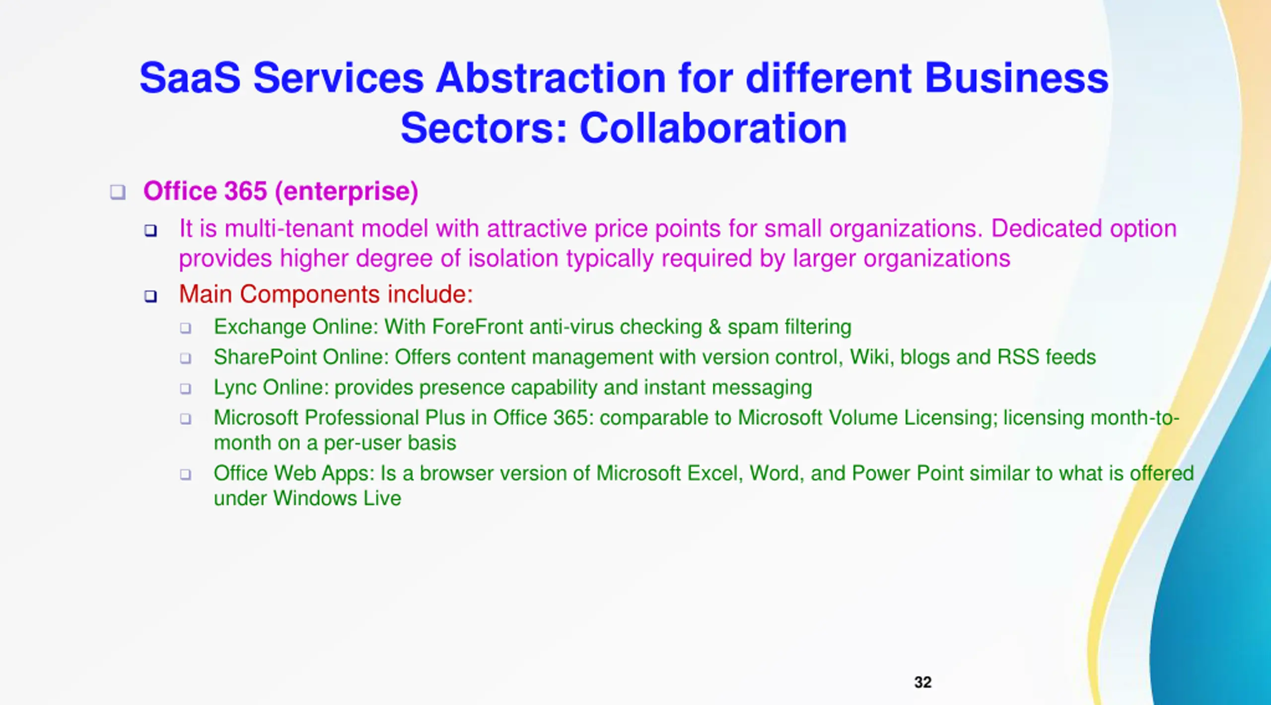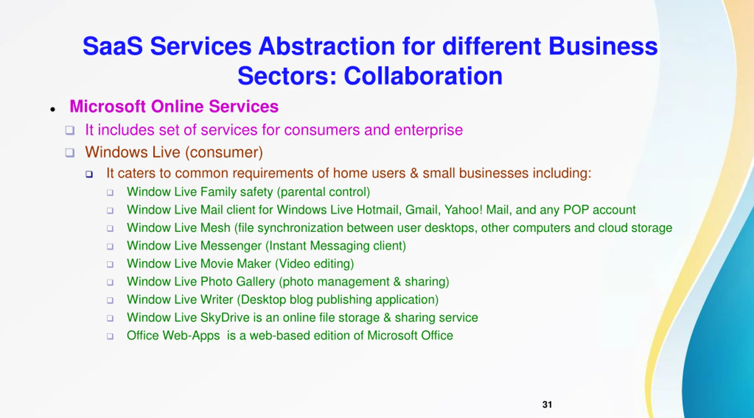 SaaS Services Abstraction for different Business Sectors: Collaboration Microsoft Online Services It includes set of services for consumers and enterprise Windows Live (consumer) It caters to common requirements of home users & small businesses including: Window Live Family safety (parental control) Window Live Mail client for Windows Live Hotmail, Gmail, Yahoo! Mail, and any POP account Window Live Mesh (file synchronization between user desktops, other computers and cloud storage Window Live Messenger (Instant Messaging client) Window Live Movie Maker (Video editing) Window Live Photo Gallery (photo management & sharing) Window Live Writer (Desktop blog publishing application) Window Live SkyDrive is an online file storage & sharing service Office Web-Apps is a web-based edition of Microsoft Office 31
