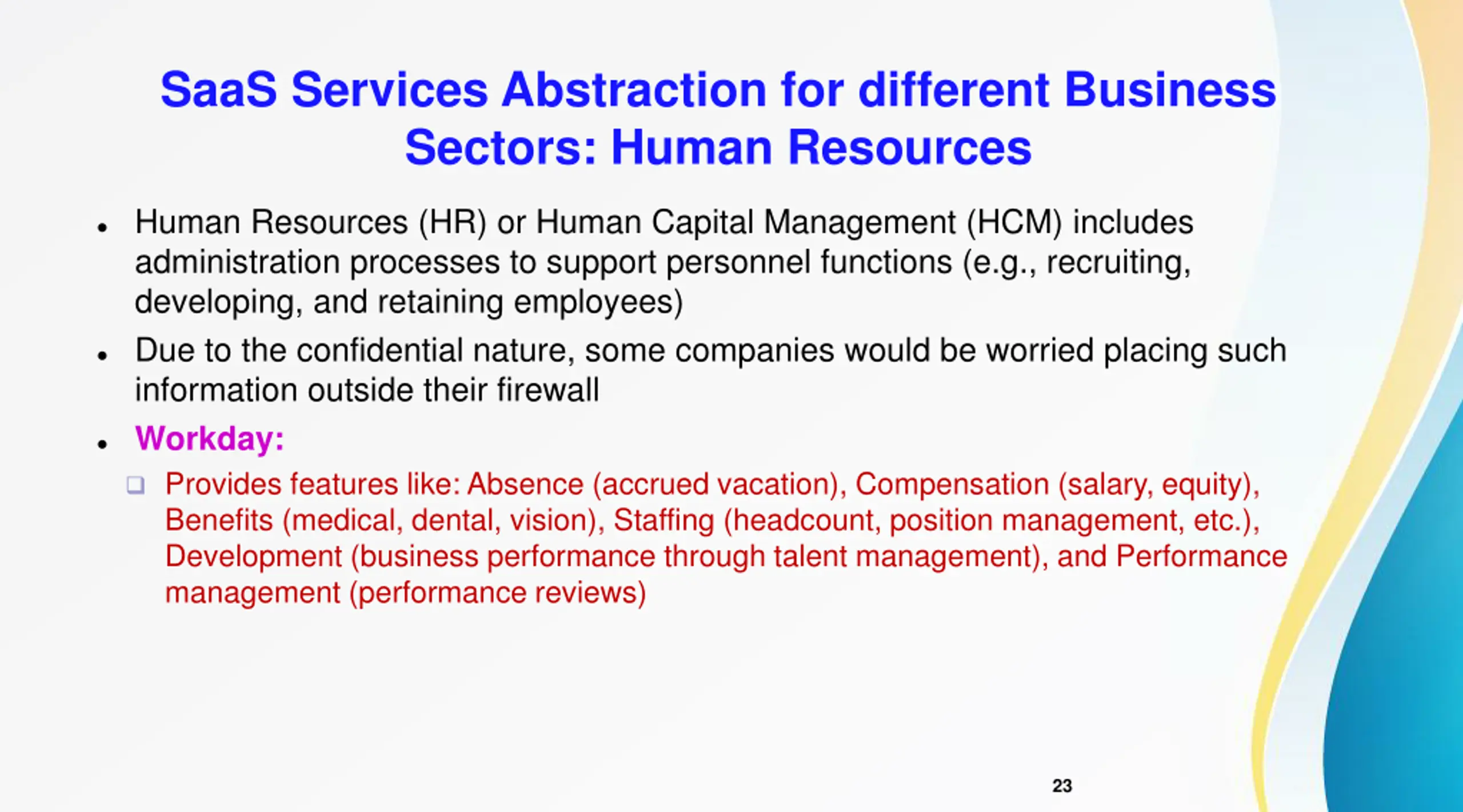 SaaS Services Abstraction for different Business Sectors: Human Resources Human Resources (HR) or Human Capital Management (HCM) includes administration processes to support personnel functions (e.g., recruiting, developing, and retaining employees) Due to the confidential nature, some companies would be worried placing such information outside their firewall Workday: Provides features like: Absence (accrued vacation), Compensation (salary, equity), Benefits (medical, dental, vision), Staffing (headcount, position management, etc.), Development (business performance through talent management), and Performance management (performance reviews) 23