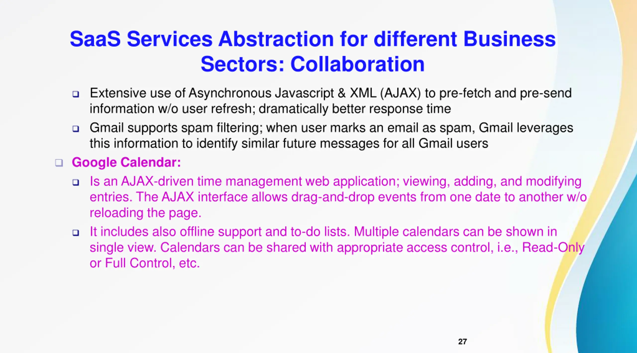 SaaS Services Abstraction for different Business Sectors: Collaboration Extensive use of Asynchronous Javascript & XML (AJAX) to pre-fetch and pre-send information w/o user refresh; dramatically better response time Gmail supports spam filtering; when user marks an email as spam, Gmail leverages this information to identify similar future messages for all Gmail users Google Calendar: Is an AJAX-driven time management web application; viewing, adding, and modifying entries. The AJAX interface allows drag-and-drop events from one date to another w/o reloading the page. It includes also offline support and to-do lists. Multiple calendars can be shown in single view. Calendars can be shared with appropriate access control, i.e., Read-Only or Full Control, etc. 27