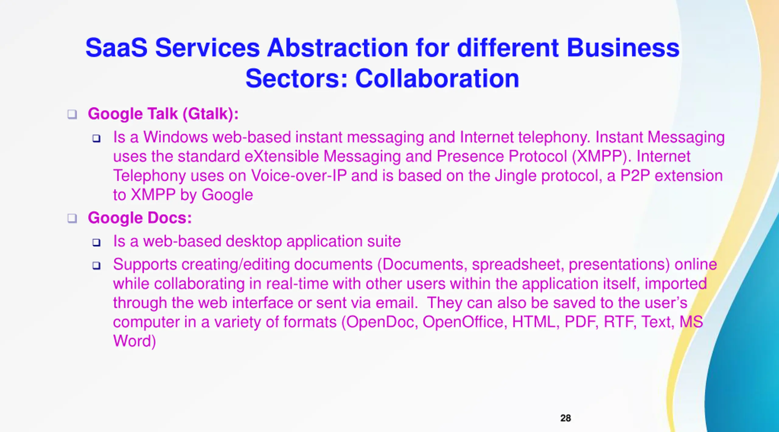 SaaS Services Abstraction for different Business Sectors: Collaboration Google Talk (Gtalk): Is a Windows web-based instant messaging and Internet telephony. Instant Messaging uses the standard eXtensible Messaging and Presence Protocol (XMPP). Internet Telephony uses on Voice-over-IP and is based on the Jingle protocol, a P2P extension to XMPP by Google Google Docs: Is a web-based desktop application suite Supports creating/editing documents (Documents, spreadsheet, presentations) online while collaborating in real-time with other users within the application itself, imported through the web interface or sent via email. They can also be saved to the user s computer in a variety of formats (OpenDoc, OpenOffice, HTML, PDF, RTF, Text, MS Word) 28