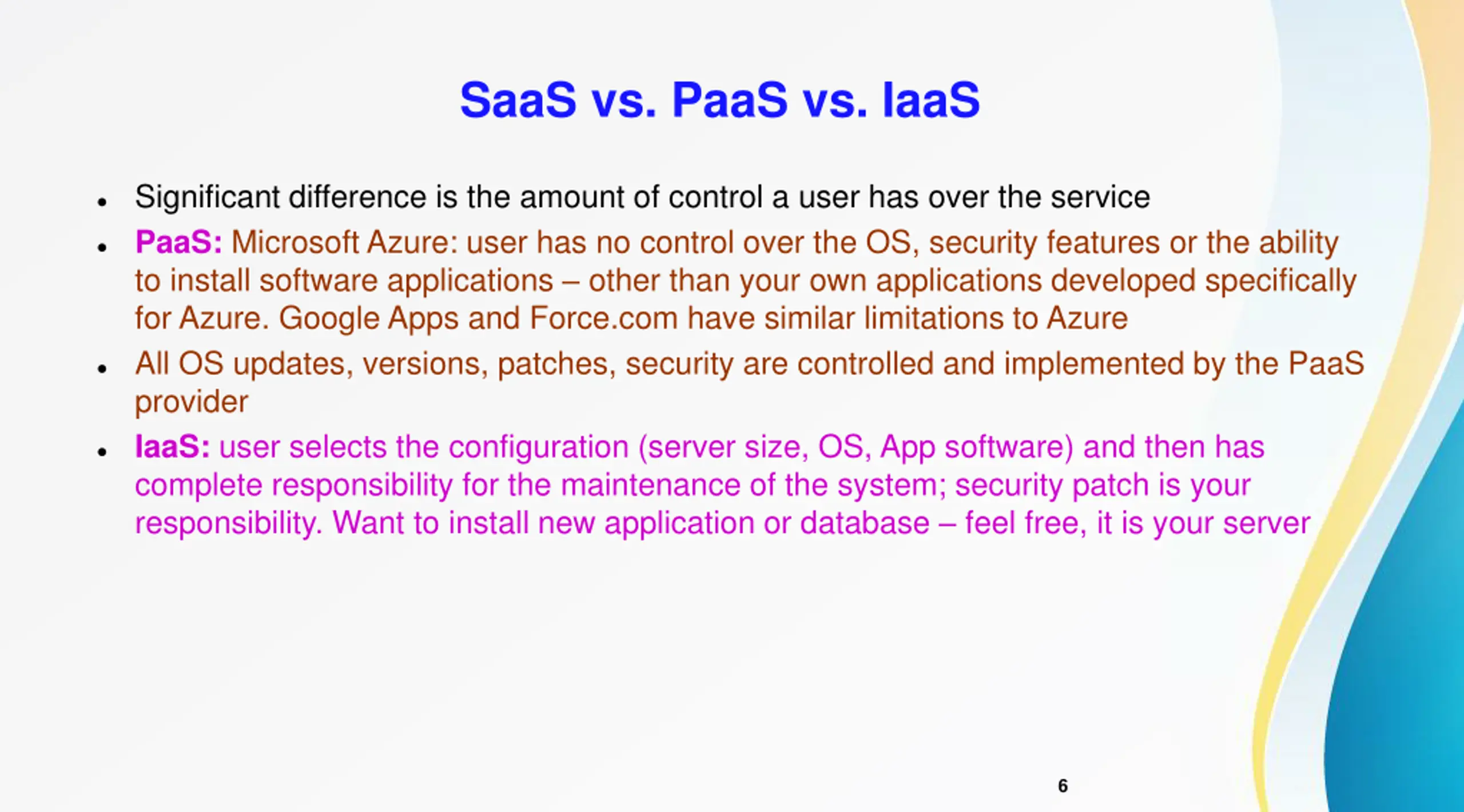 SaaS vs. PaaS vs. IaaS Significant difference is the amount of control a user has over the service PaaS: Microsoft Azure: user has no control over the OS, security features or the ability to install software applications other than your own applications developed specifically for Azure. Google Apps and Force.com have similar limitations to Azure All OS updates, versions, patches, security are controlled and implemented by the PaaS provider IaaS: user selects the configuration (server size, OS, App software) and then has complete responsibility for the maintenance of the system; security patch is your responsibility. Want to install new application or database feel free, it is your server 6