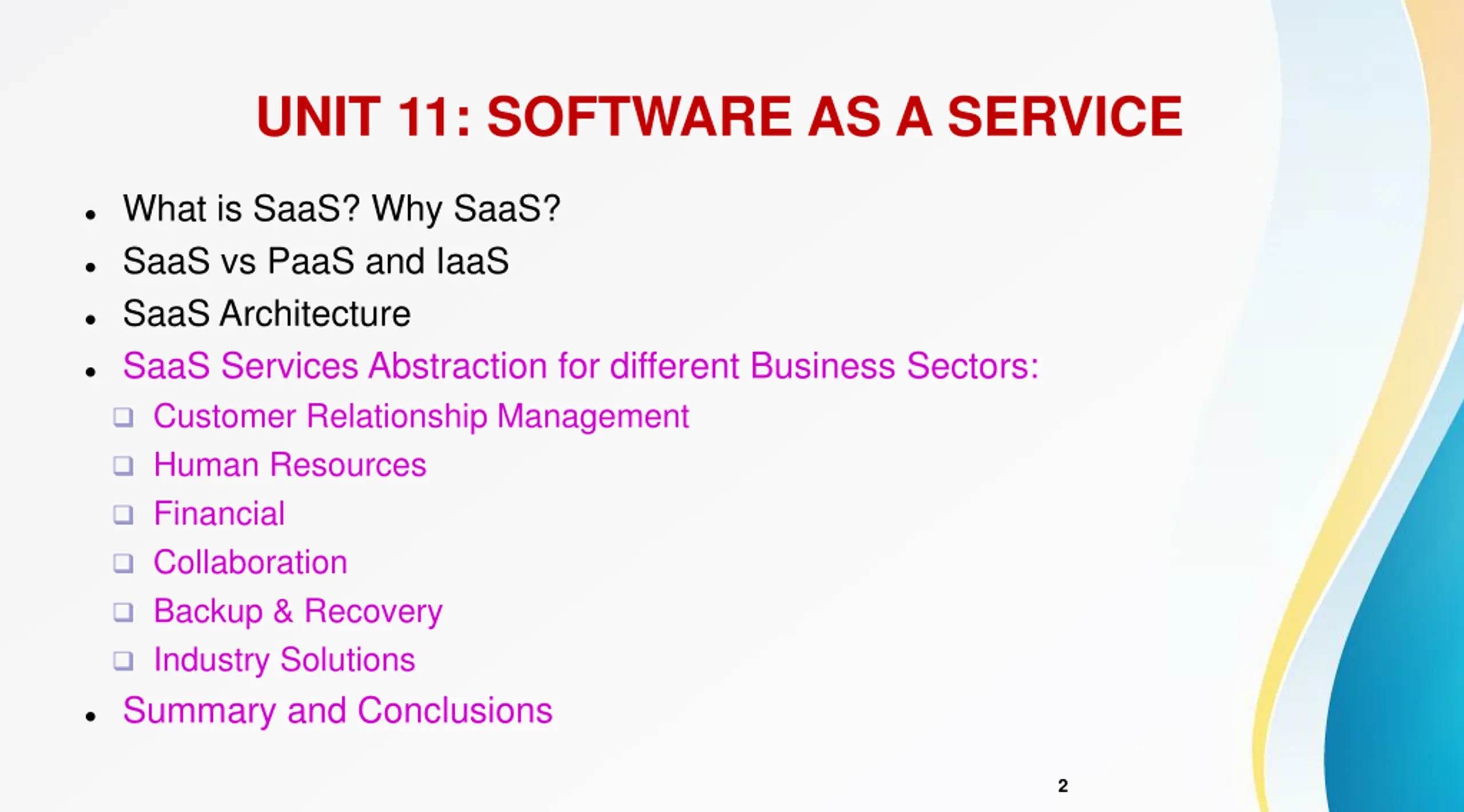 UNIT 11: SOFTWARE AS A SERVICE What is SaaS? Why SaaS? SaaS vs PaaS and IaaS SaaS Architecture SaaS Services Abstraction for different Business Sectors: Customer Relationship Management Human Resources Financial Collaboration Backup & Recovery Industry Solutions Summary and Conclusions 2
