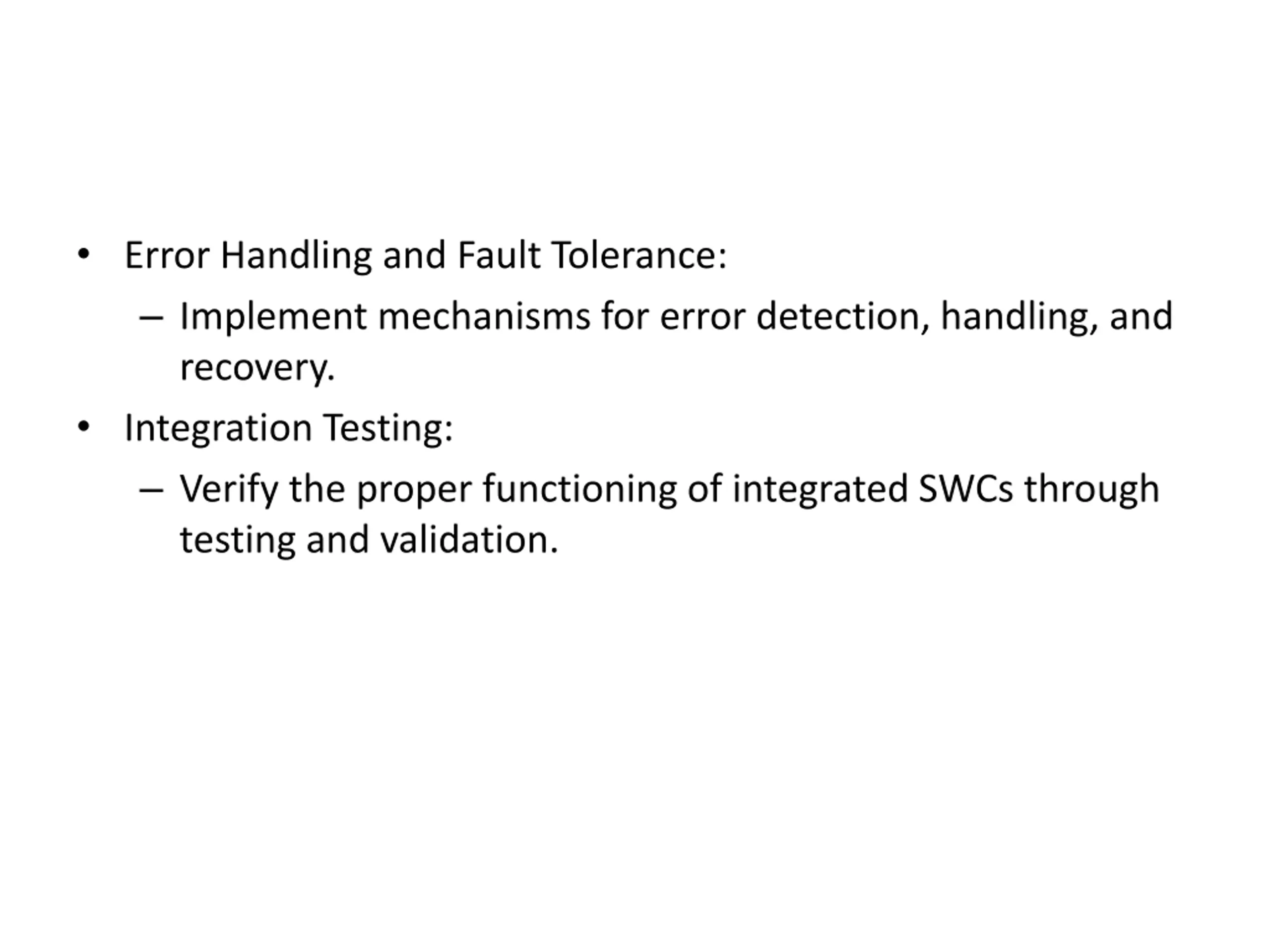 Error Handling and Fault Tolerance: Implement mechanisms for error detection, handling, and recovery. Integration Testing: Verify the proper functioning of integrated SWCs through testing and validation.