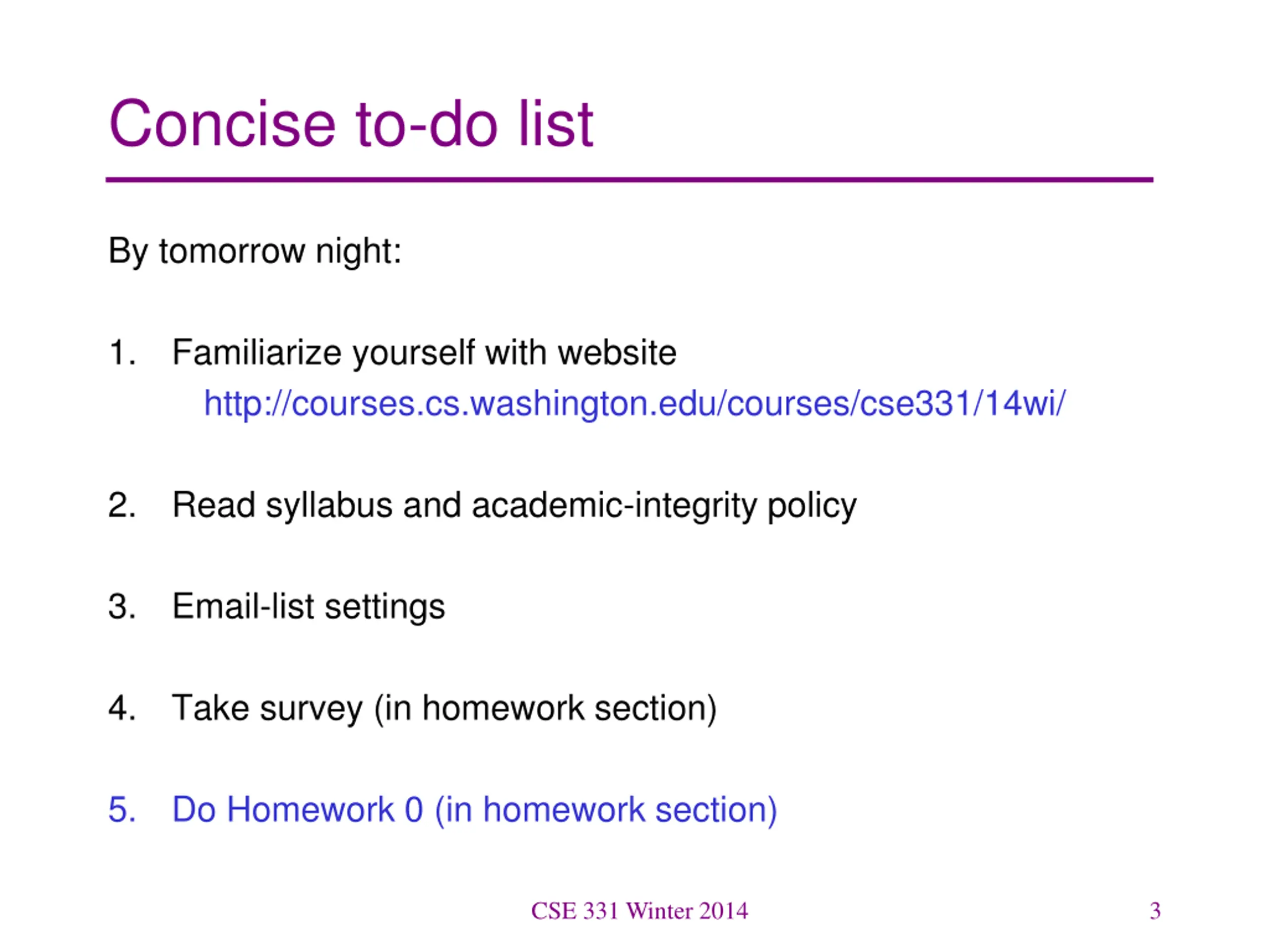 Concise to-do list By tomorrow night: 1. Familiarize yourself with website http://courses.cs.washington.edu/courses/cse331/14wi/ 2. Read syllabus and academic-integrity policy 3. Email-list settings 4. Take survey (in homework section) 5. Do Homework 0 (in homework section) CSE 331 Winter 2014 3