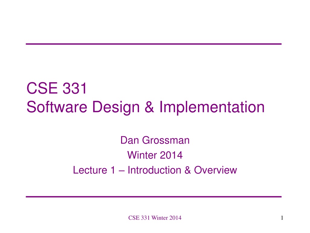CSE 331 Software Design & Implementation Dan Grossman Winter 2014 Lecture 1 Introduction & Overview CSE 331 Winter 2014 1