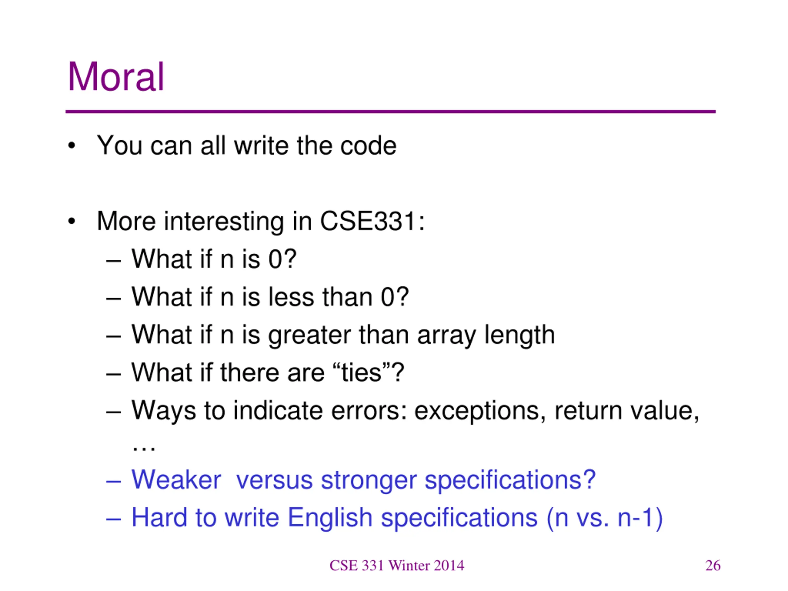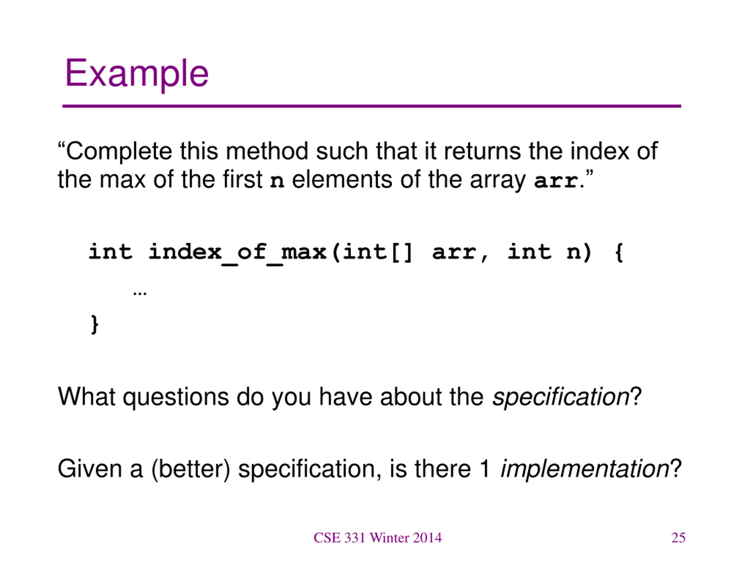 Example Complete this method such that it returns the index of the max of the first n elements of the array arr. int index_of_max(int[] arr, int n) { } What questions do you have about the specification? Given a (better) specification, is there 1 implementation? CSE 331 Winter 2014 25