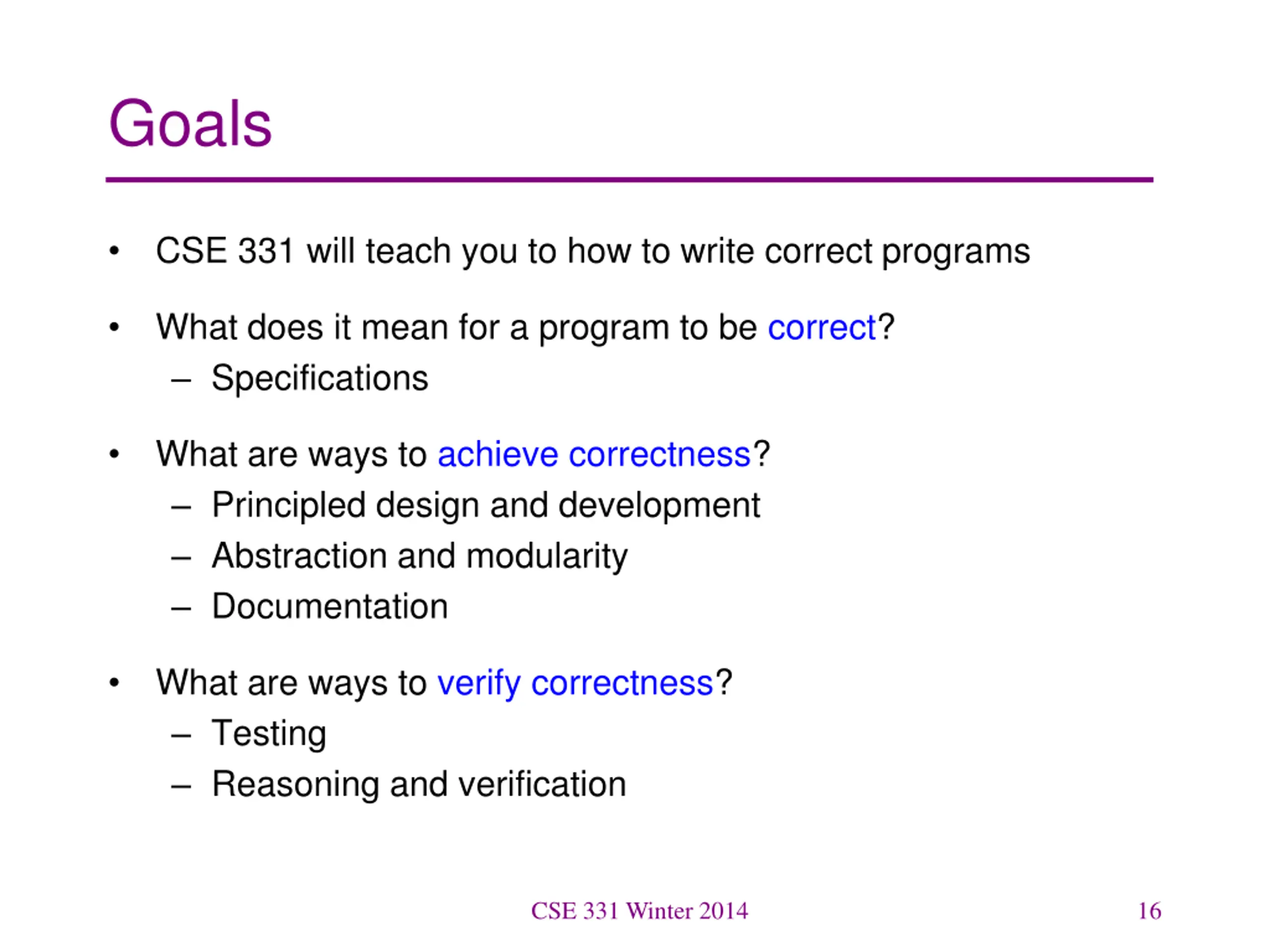 Goals CSE 331 will teach you to how to write correct programs What does it mean for a program to be correct? Specifications What are ways to achieve correctness? Principled design and development Abstraction and modularity Documentation What are ways to verify correctness? Testing Reasoning and verification CSE 331 Winter 2014 16