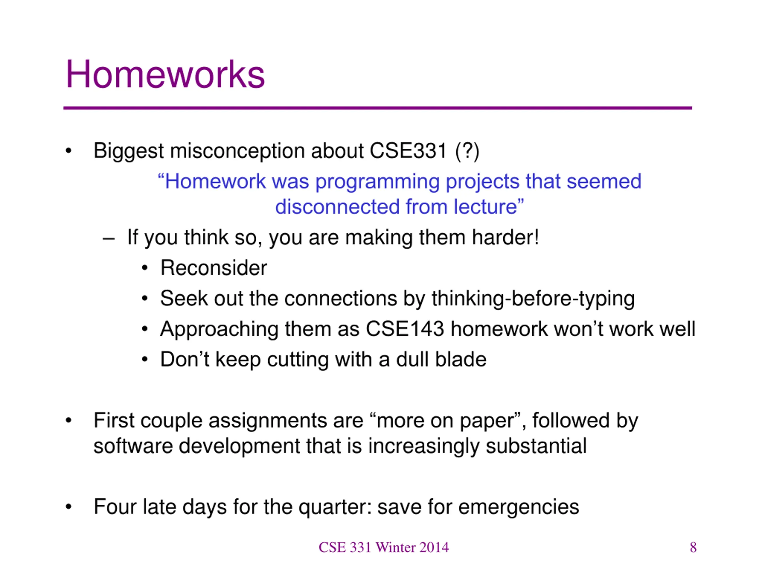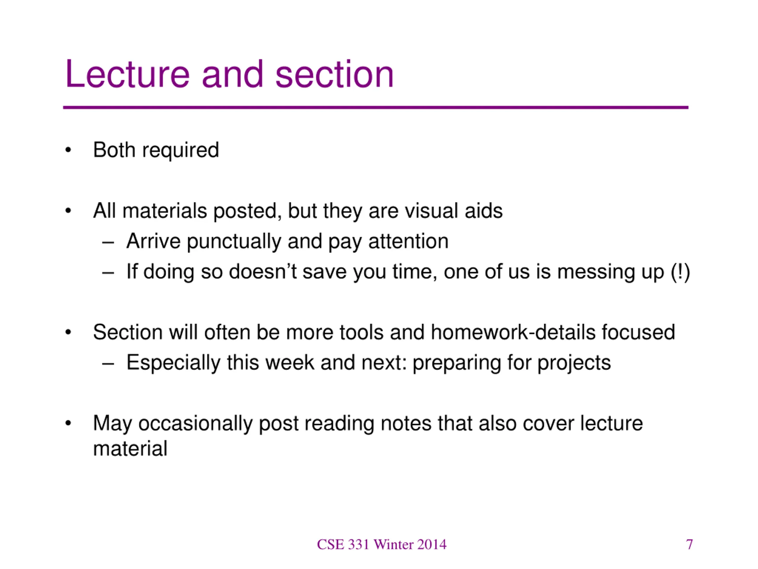 Lecture and section Both required All materials posted, but they are visual aids Arrive punctually and pay attention If doing so doesn t save you time, one of us is messing up (!) Section will often be more tools and homework-details focused Especially this week and next: preparing for projects May occasionally post reading notes that also cover lecture material CSE 331 Winter 2014 7