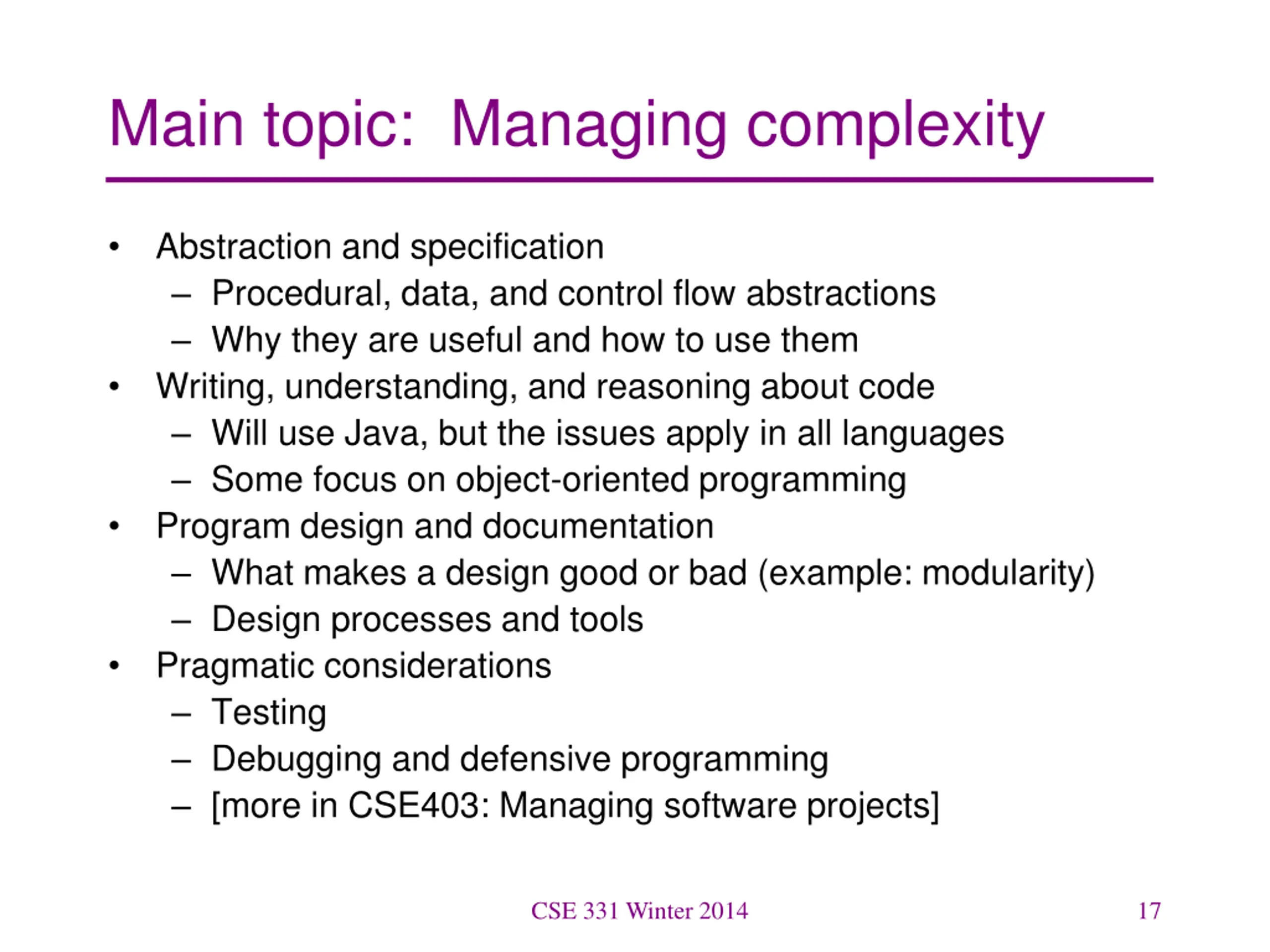 Main topic: Managing complexity Abstraction and specification Procedural, data, and control flow abstractions Why they are useful and how to use them Writing, understanding, and reasoning about code Will use Java, but the issues apply in all languages Some focus on object-oriented programming Program design and documentation What makes a design good or bad (example: modularity) Design processes and tools Pragmatic considerations Testing Debugging and defensive programming [more in CSE403: Managing software projects] CSE 331 Winter 2014 17