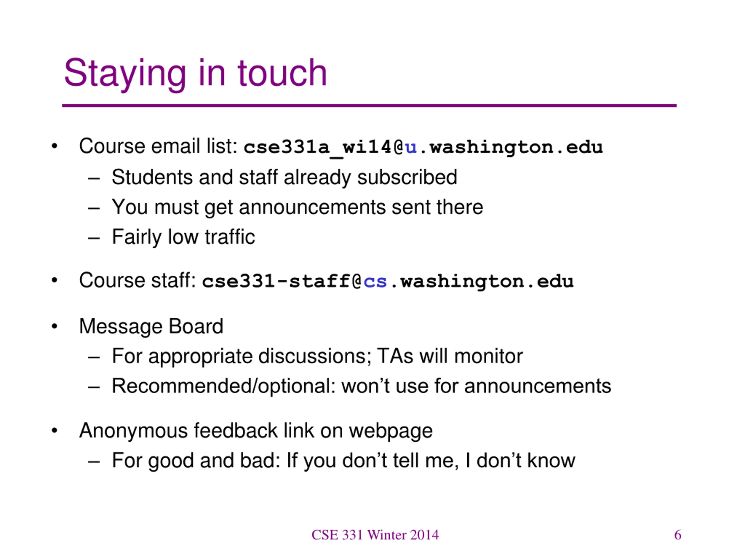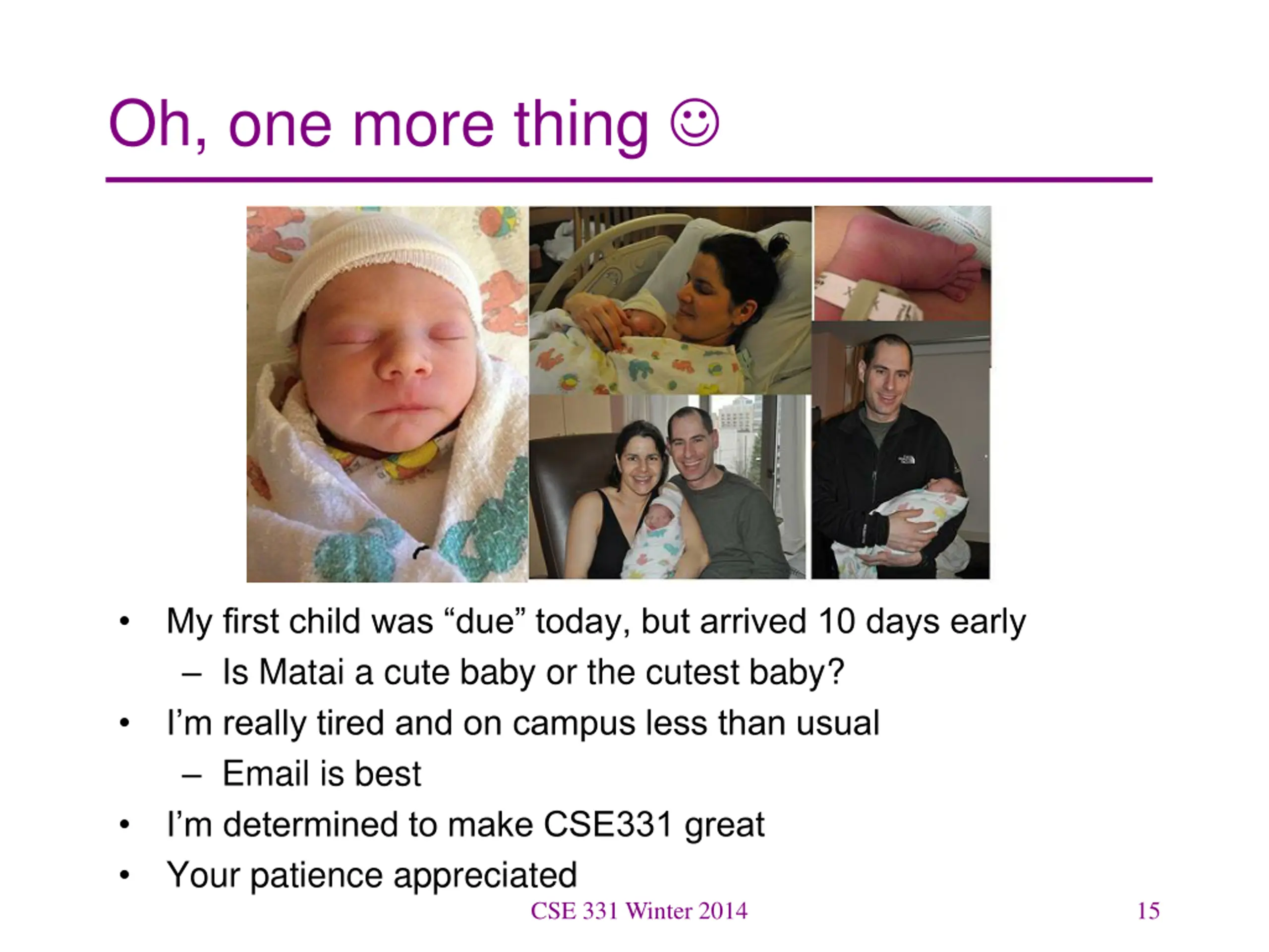 Oh, one more thing My first child was due today, but arrived 10 days early Is Matai a cute baby or the cutest baby? I m really tired and on campus less than usual Email is best I m determined to make CSE331 great Your patience appreciated CSE 331 Winter 2014 15