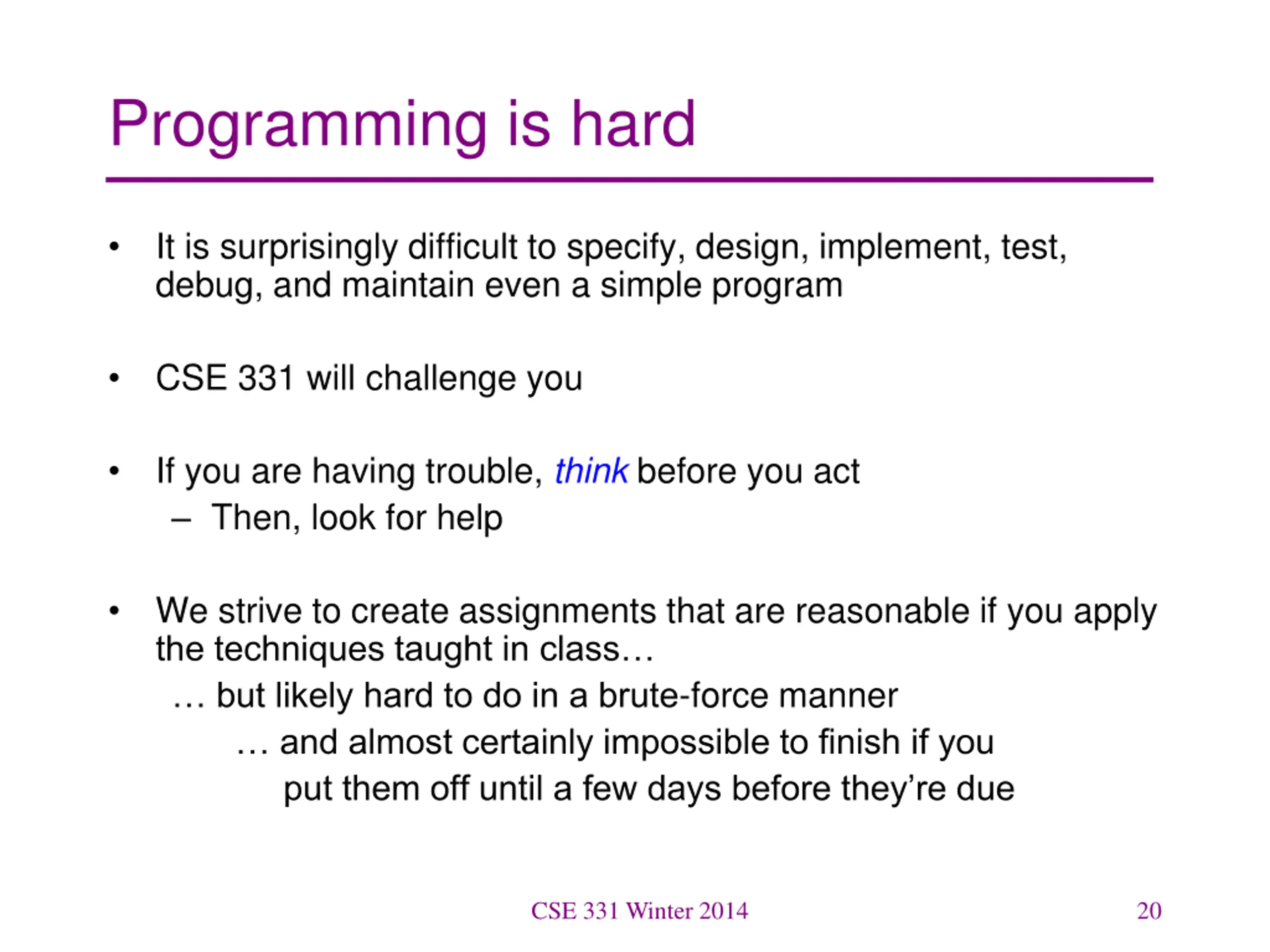Programming is hard It is surprisingly difficult to specify, design, implement, test, debug, and maintain even a simple program CSE 331 will challenge you If you are having trouble, think before you act Then, look for help We strive to create assignments that are reasonable if you apply the techniques taught in class but likely hard to do in a brute-force manner and almost certainly impossible to finish if you put them off until a few days before they re due CSE 331 Winter 2014 20